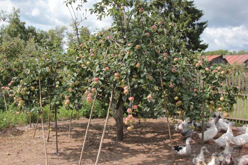 Оригинально смотрится низкорослая яблоня на полукарликовом подвое. Ветки наклонились под тяжестью яблок, поэтому под каждую из них поставлена опора.