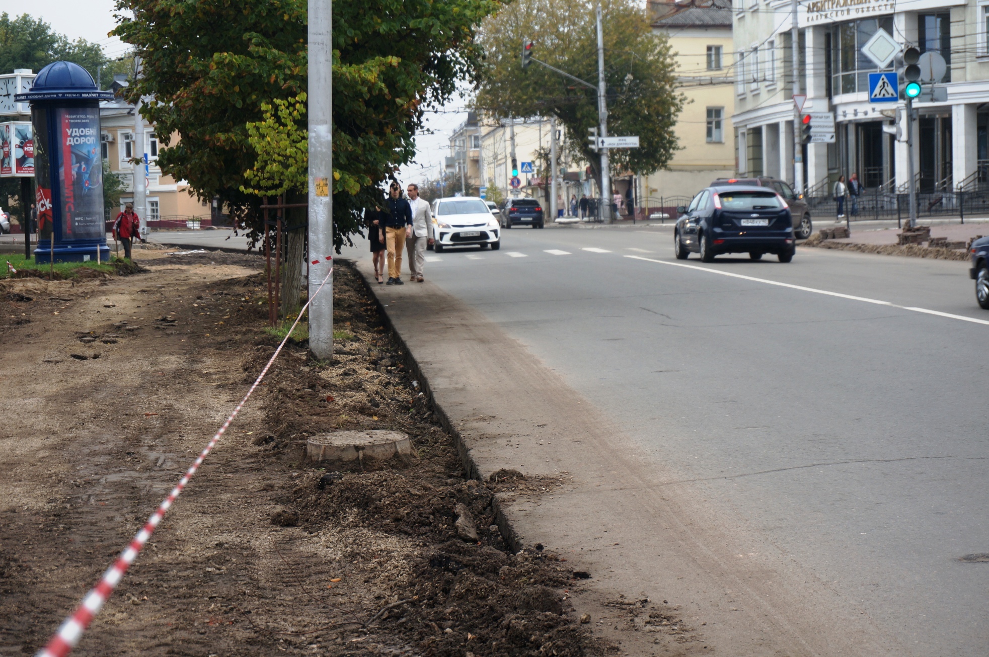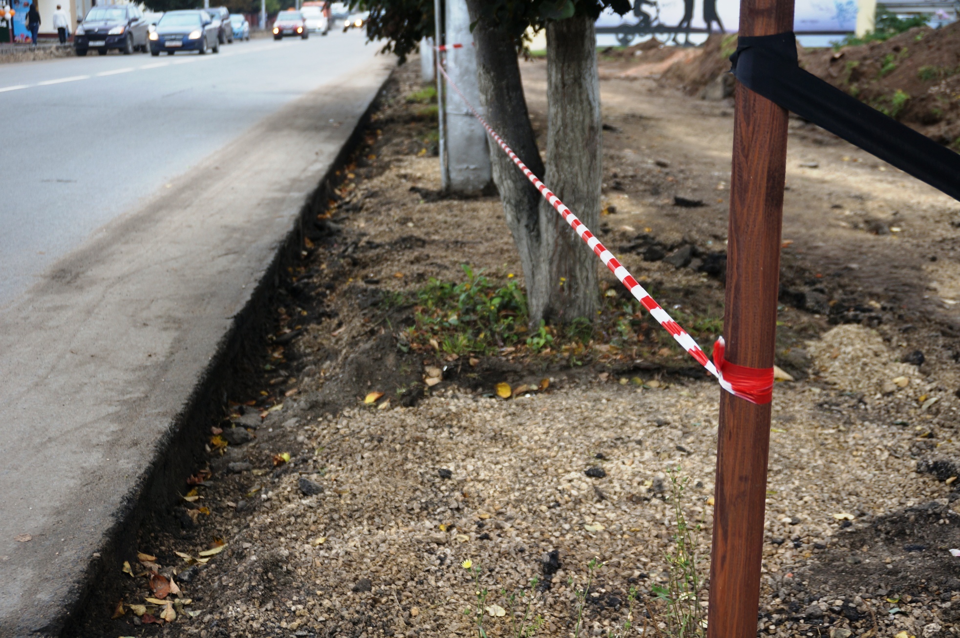 В середине недели старый тротуар перекопали и натянули красно-белые ленточки. И всё. Красный и белый цвета должны каким-то образом сами передавать калужанам информацию, как им перейти дорогу или хотя бы попасть на остановку.