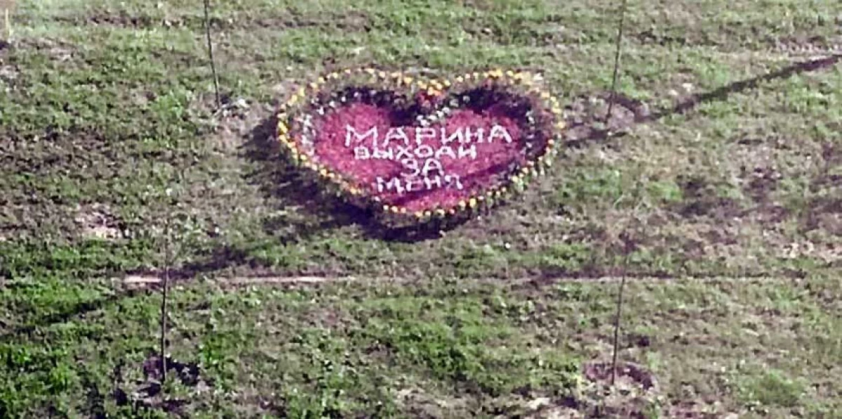 Жители многоэтажки на ул. Ленина, 221, увидели из окна послание, выложенное цветами. И теперь они гадают, каков же был ответ девушки.
