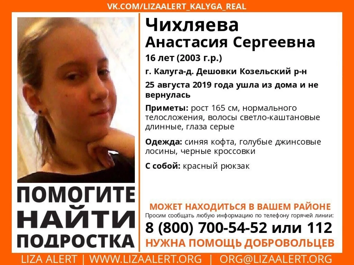 16-летняя Анастасия Чихляева пропала 25 августа в деревне Дешовки Козельского района, сообщается в официальной группе добровольного поискового отряда «Лиза Алерт».