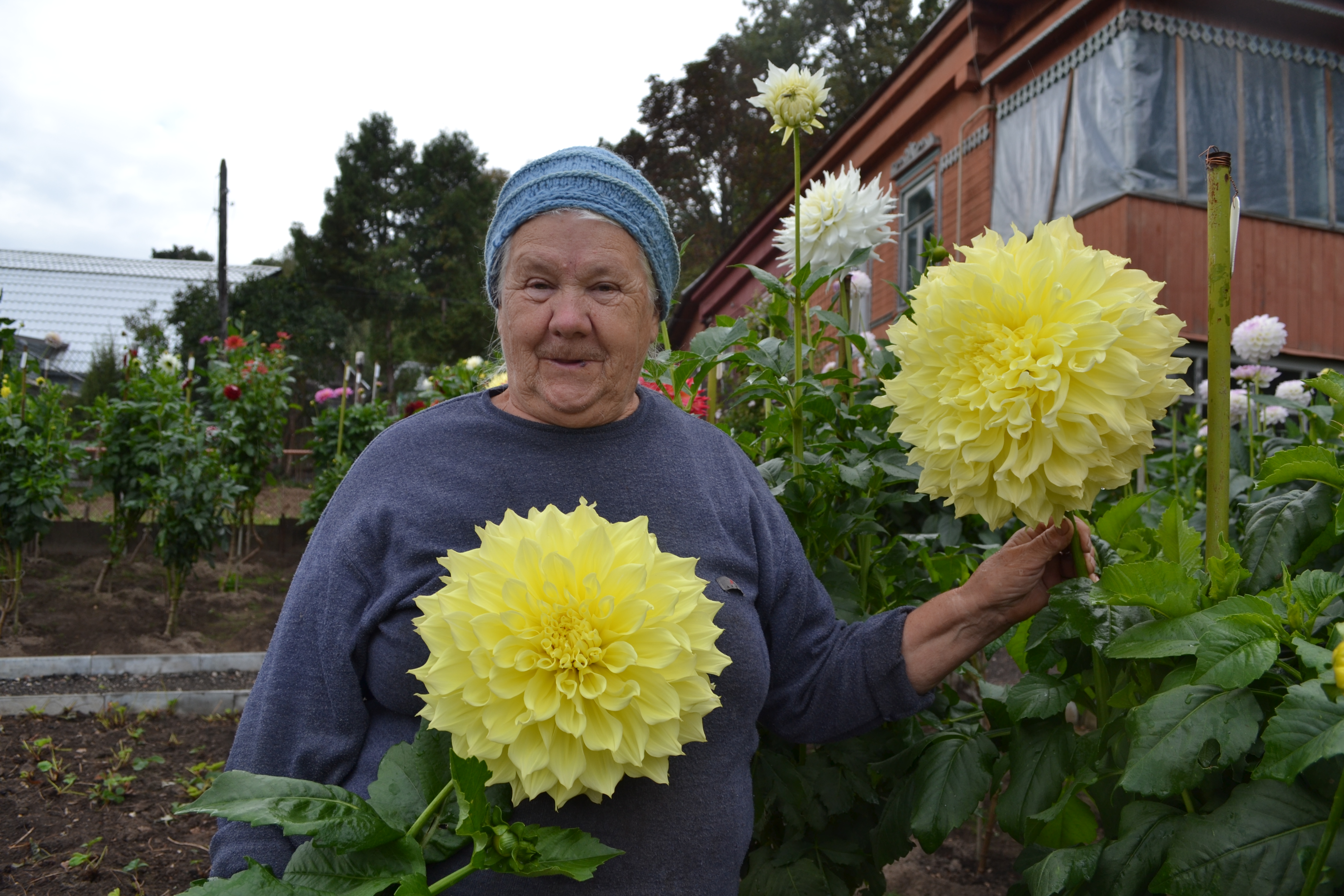 — У нас 140 сортов, — с гордостью говорит Татьяна Васильевна. — Все очень красивые! Выращивать цветы нелёгкий труд. Клубни осенью нужно выкопать, сохранить, весной прорастить, поделить, посадить и вырастить. Одна женщина как-то пришла и удивляется, что на нашем участке каждый цветок в прекрасном состоянии: «А у меня один кустик хороший, другой плохой». Так ведь надо ухаживать за каждым! Подкормить. В основном подкармливаем коровяком, один раз использовали суперфосфат. Я обычно шучу, что у меня огород подметён метёлкой, — ни одной травинки: всё прополото, прорыхлено. Растения стоят ровненькие, в ряд. У основания каждого — «блюдце»: небольшие бороздки вокруг цветка, чтобы вода не растекалась, а шла только под корень.