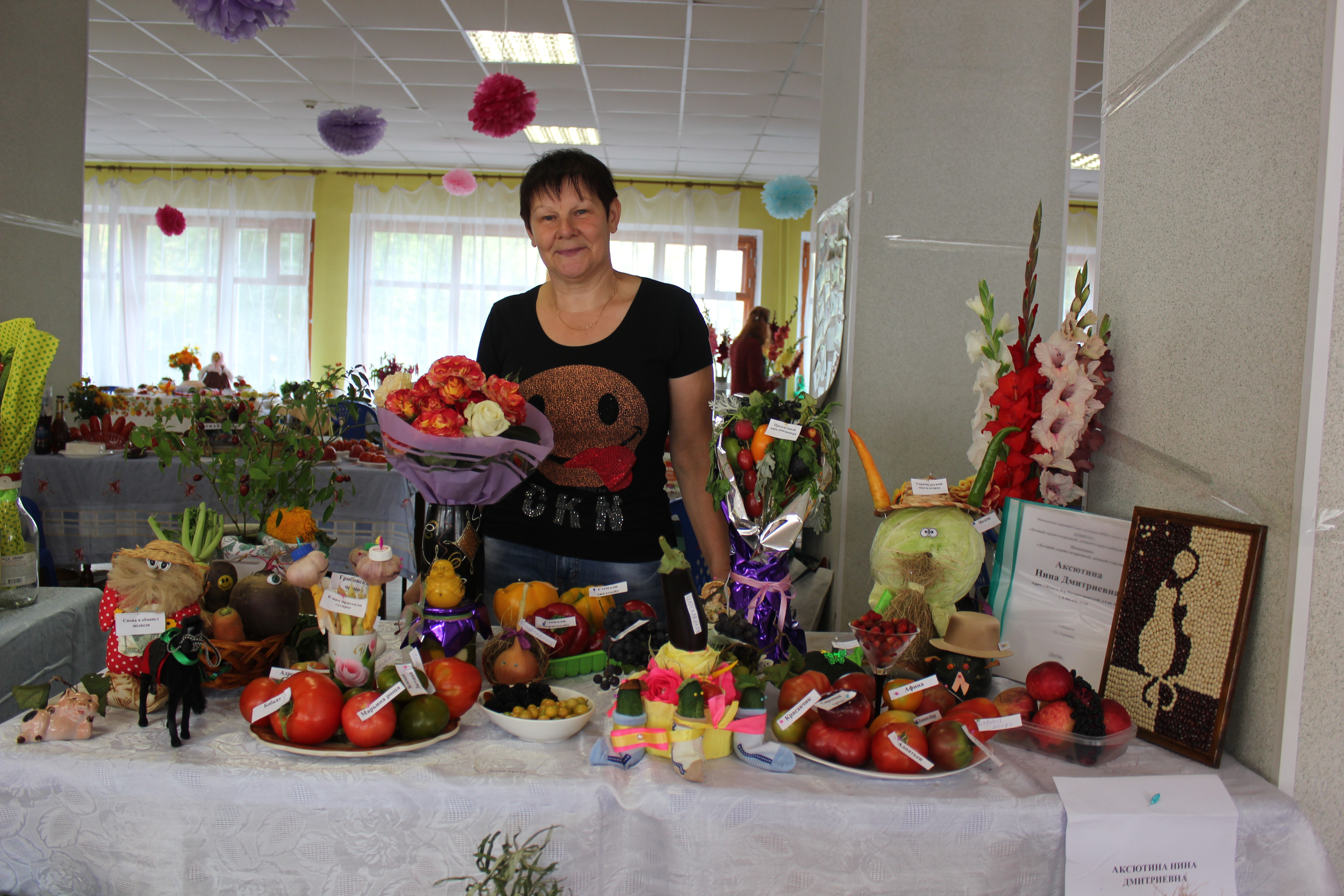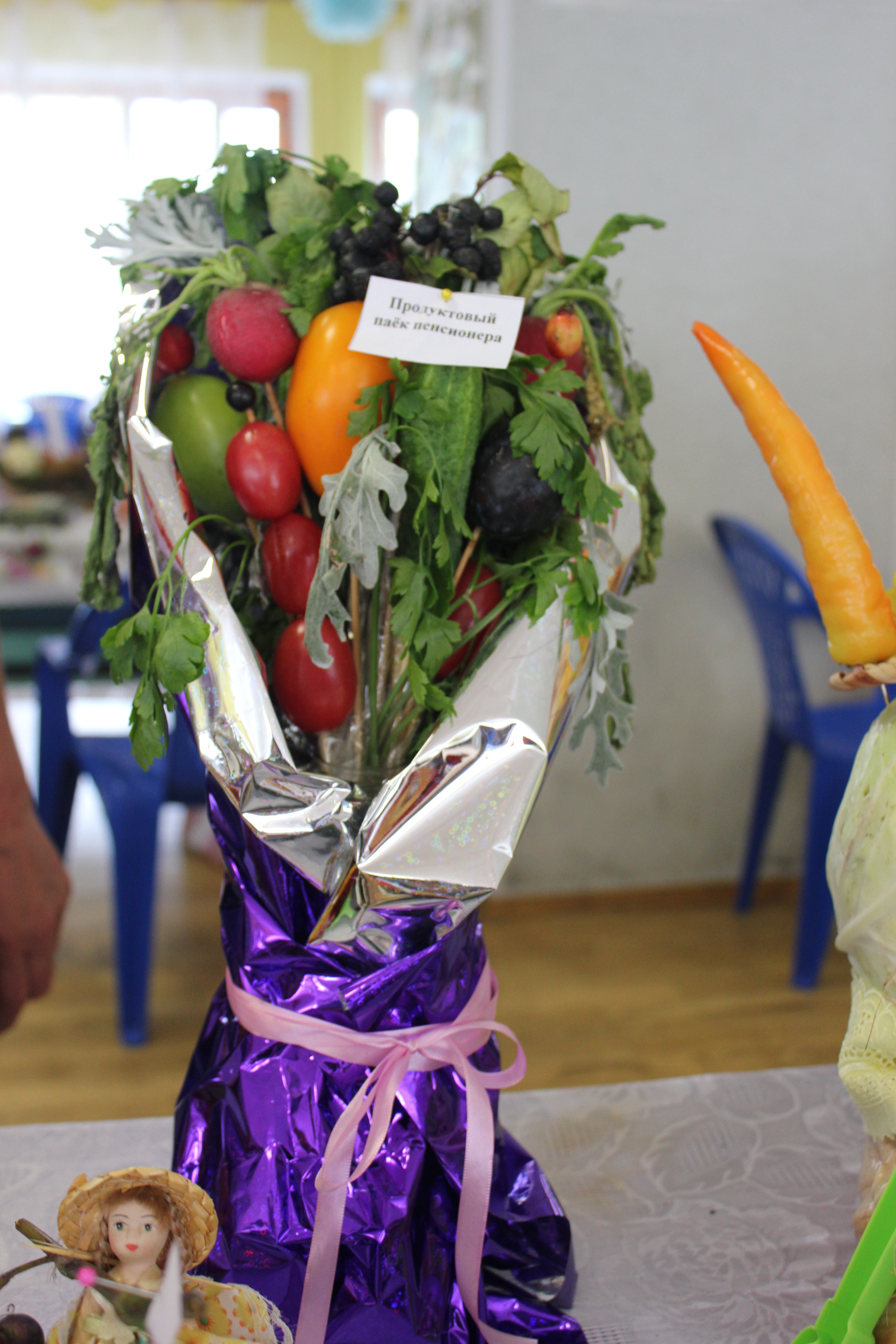 Творчески подошла к оформлению своих работ калужанка Нина АКСЮТИНА. Из фасоли она сделала картину, из капусты, перца и морковки соорудила козла, а редис, помидоры, огурцы, сливы, черноплодную рябину и зелень оформила в букет, который назвала «Паёк пенсионера».