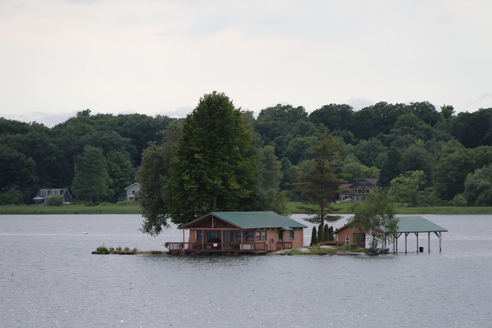 Побывали в местечке под названием «Тысяча островов». Именно там был изобретён знаменитый соус для салатов с одноимённым названием. Виды очень живописные. Это река святого Лаврентия, по которой идёт граница между США и Канадой. И там, действительно, порядка 1864 островов. Говорят, что это вершины гор, ушедших со временем под воду. На островах — частные домики и гостиницы. Жильё здесь одно из самых престижных и дорогих в Канаде. Так что там — сплошные миллионеры. Интересно, что есть совсем крошечные острова, но даже на них умудряются поставить дом буквально в двух метрах от воды.