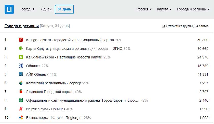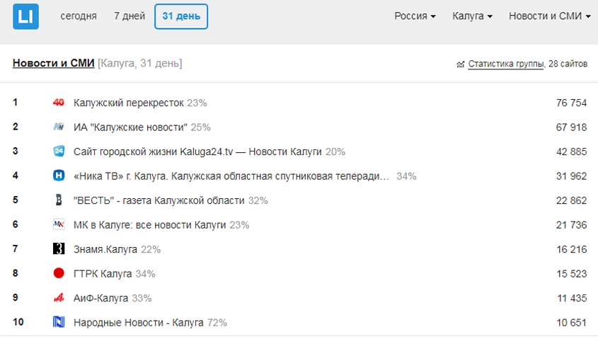 Прежде чем переходить к ТОПу, еще раз напомним, что ряд калужских сайтов либо не зарегистрирован в «Лайфинтернете», либо закрыл свою статистику от посторонних глаз. В наш обзор эти ресурсы не попадают.