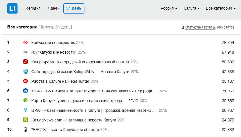 Мы продолжаем публиковать наш ежемесячный рейтинг калужских сайтов на основании данных статистки сервиса «Лайфинтернет», который ранжирует ресурсы по популярности в Калужском регионе.