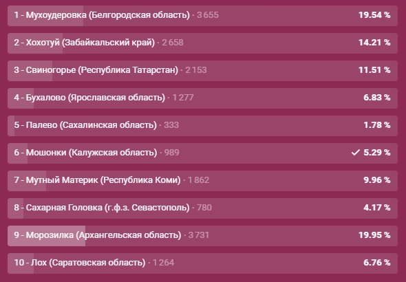 По состоянию на 16:00 вторника, 12 ноября, лидирует Морозилка. На пятки ей наступает Мухоудеровка. Мошонки пока идут на восьмом месте.