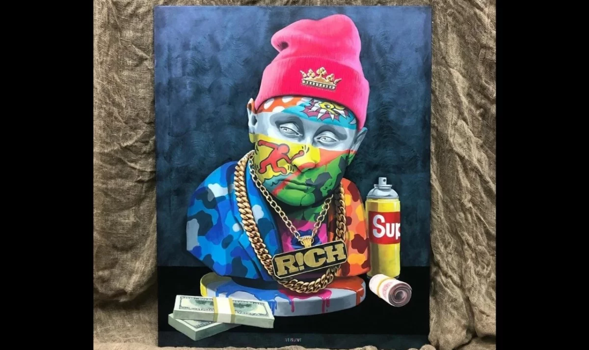 - Прошу относиться к данной картине иронично, - написала Виктория. - Я достаточно аполитична. Но, когда просят написать портрет известного человека, не могу не выразить через него своё видение реальности. Картина сделана под заказ и не продаётся.
