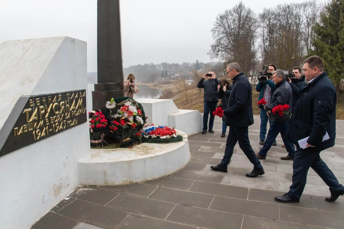 В этот же день Владислав Шапша в сопровождении врио главы Тарусской районной администрации Руслана Смоленского принял участие в возложении цветов к Памятнику тарусянам, погибшим на фронтах в годы Великой Отечественной войны. Рядом на набережной Оки находится Стела с именами пяти местных жителей, удостоенных звания «Герой Советского Союза», и Стела в честь Героя России, уроженца Тарусы, легендарного командарма Великой Отечественной войны Михаила Григорьевича Ефремова.