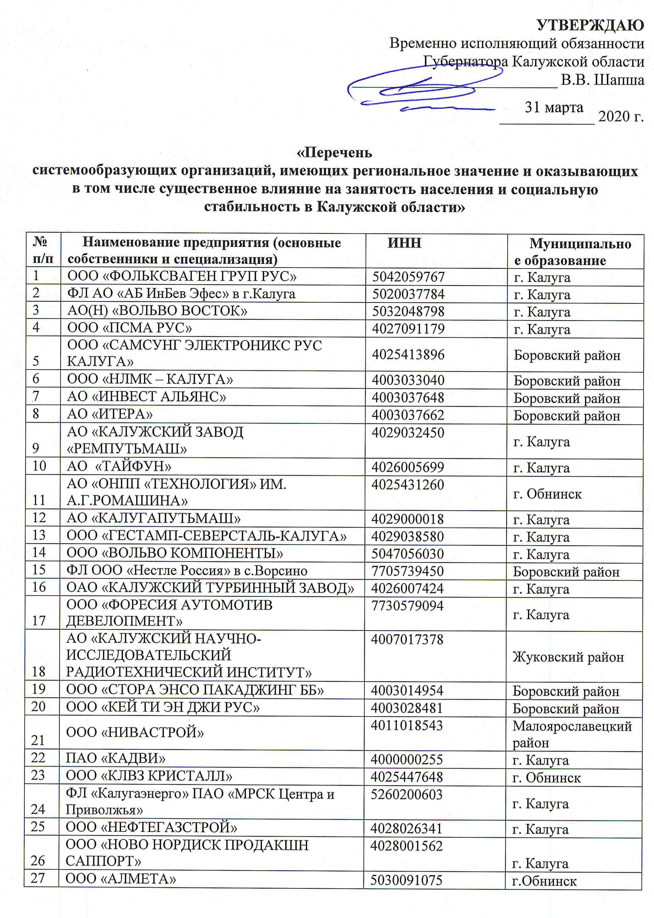 UPD. Опубликован список калужских предприятий, которые продолжат работу 6 апреля.