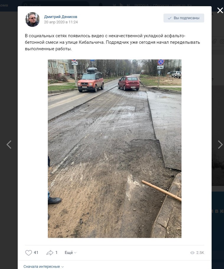 Следит градоначальник и за сообщениями других пользователей. Благодаря этому, в частности, удалось решить проблему с некачественным ремонтом дороги на улице Кибальчича.