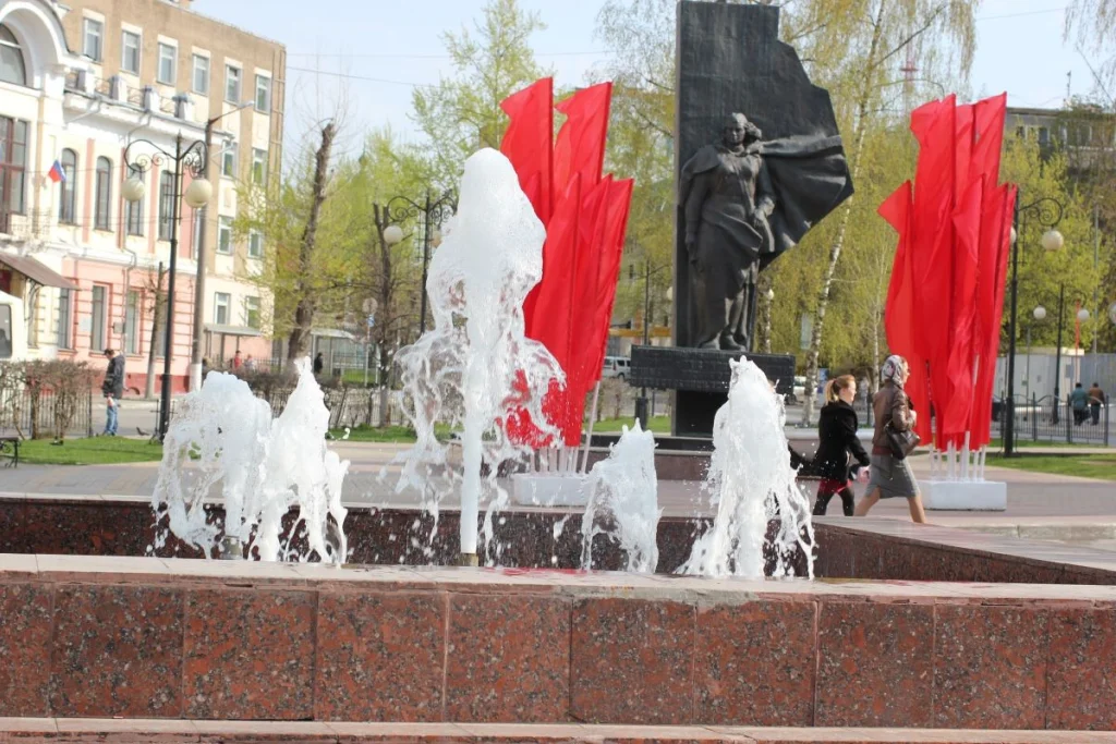 Пока не работает фонтан на площади Победы, так как изваяние Родины-матери украшают 30-метровыми георгиевскими лентами.