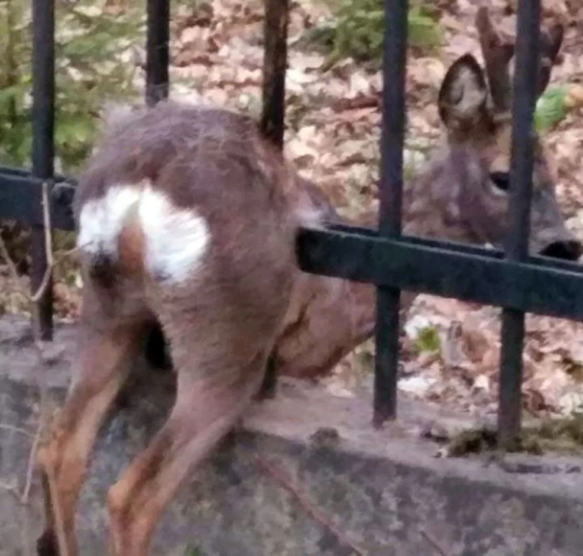 Оленёнок застрял в заборе, потому что попа не пролезла