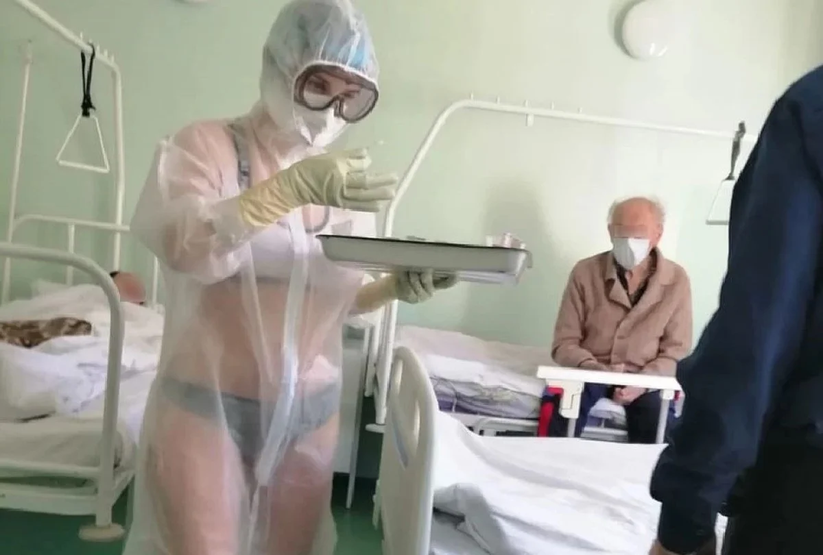 В Тульской области медсестра в одной из коронавирусных больниц надела купальник под прозрачный защитный костюм. Фото опубликовала «КП-Тула».