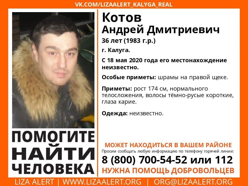 18 мая ушёл из дома и до сих пор не вернулся 36-летний калужанин Андрей Котов.