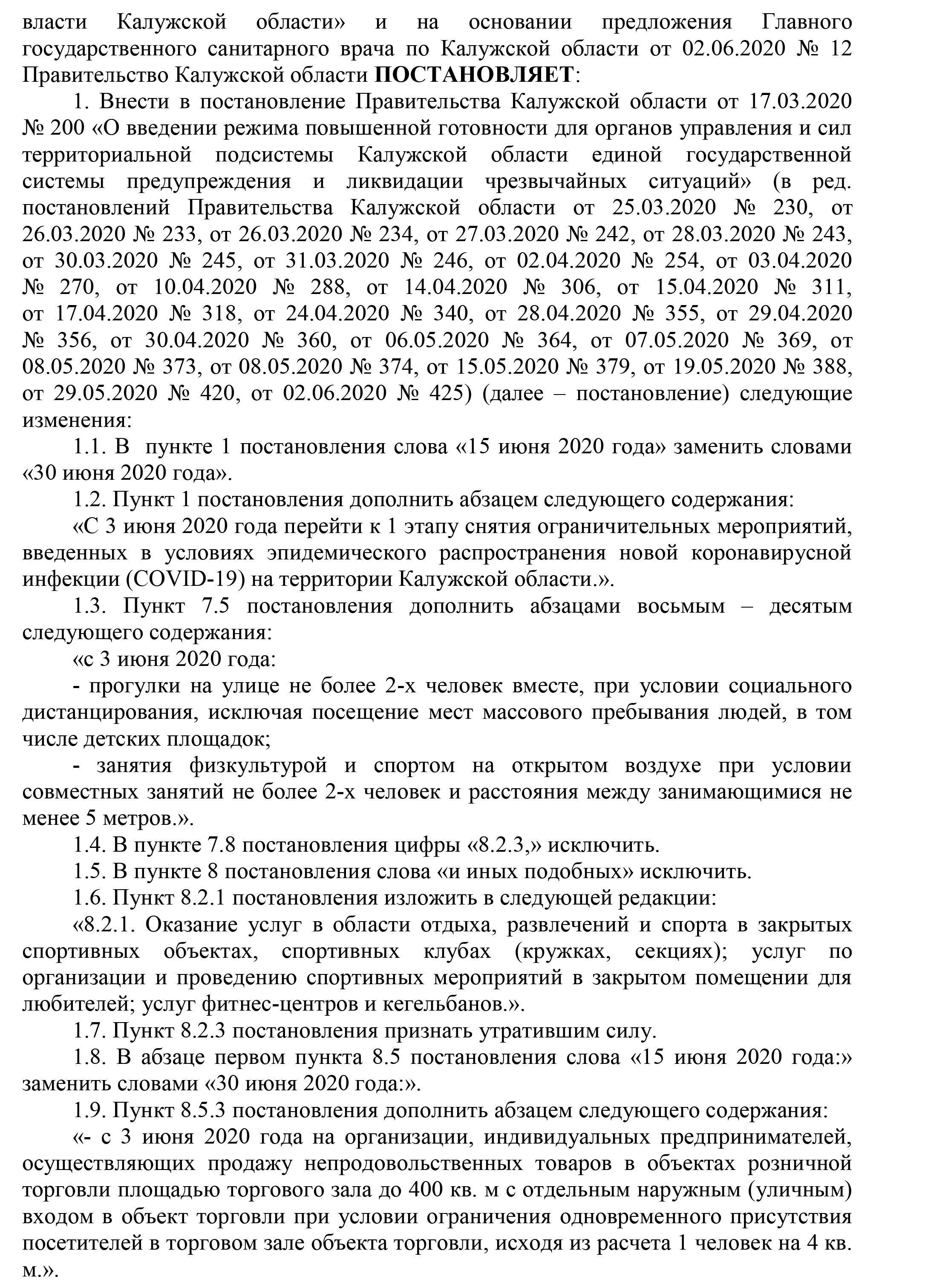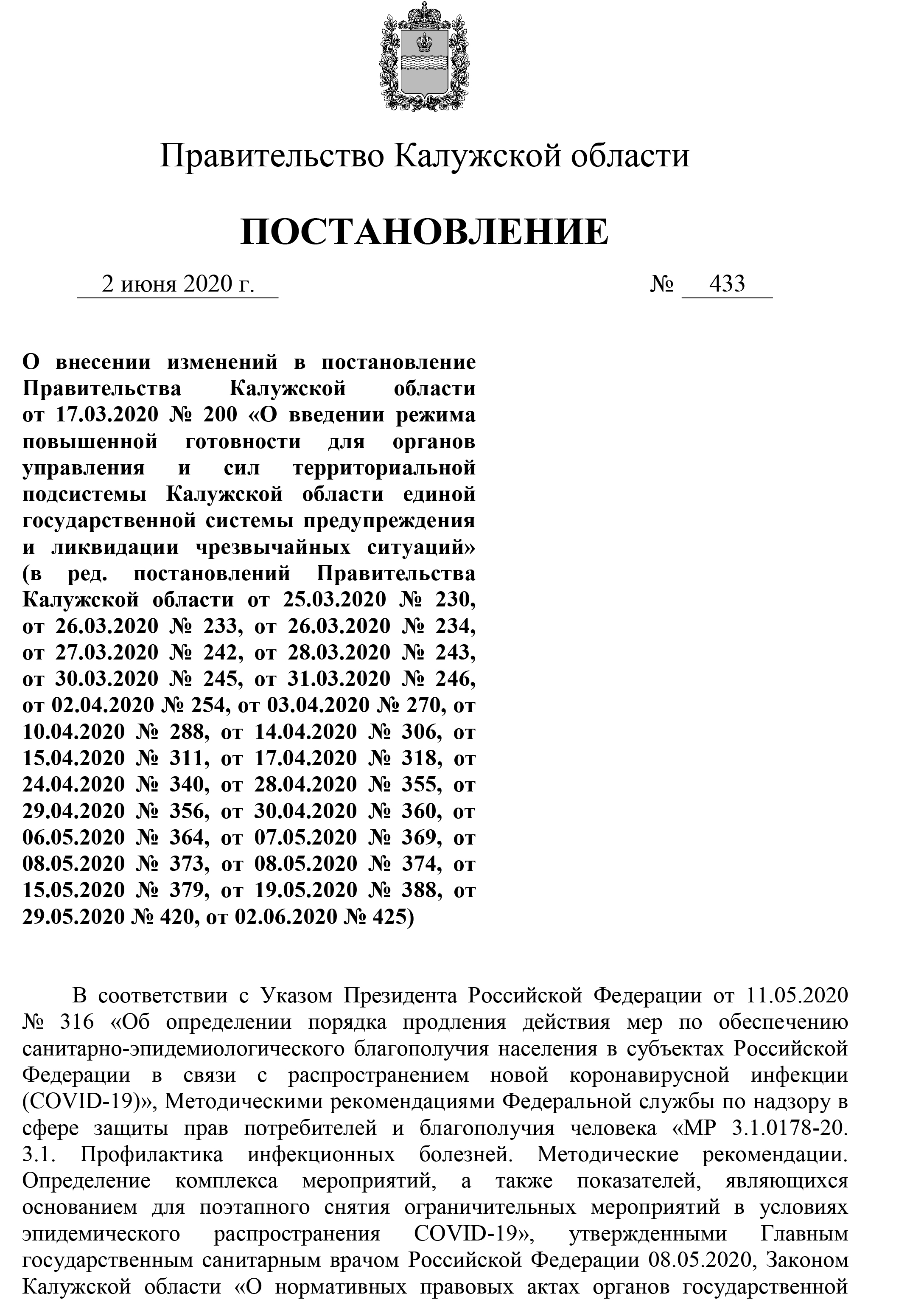 Публикуем полный текст постановления правительства Калужской области №433 от 02.06.2020 г.: