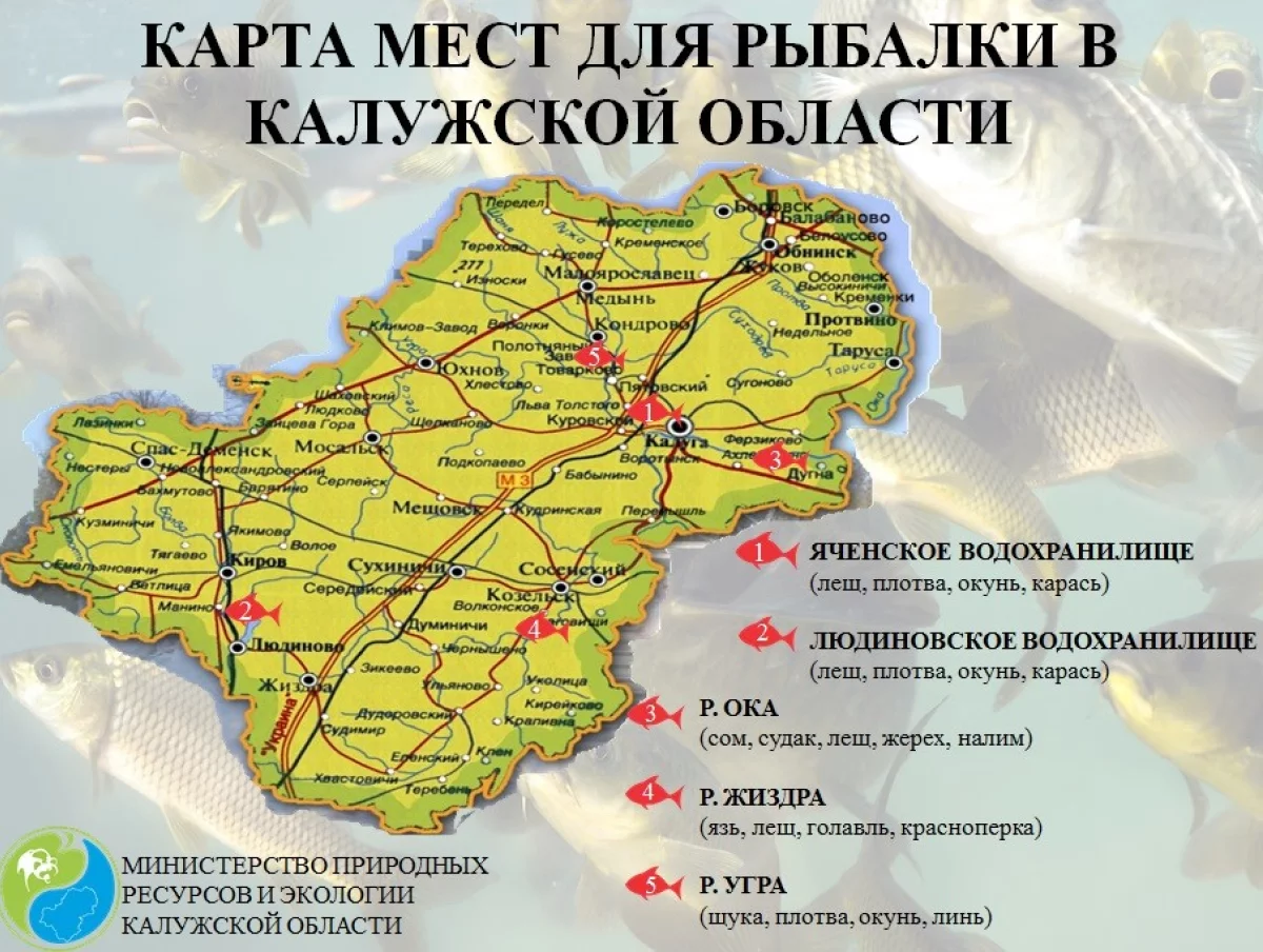 Среди популярных общедоступных мест для рыбалки можно отметить Людиновское водохранилище, реку Угру и реку Жиздру.