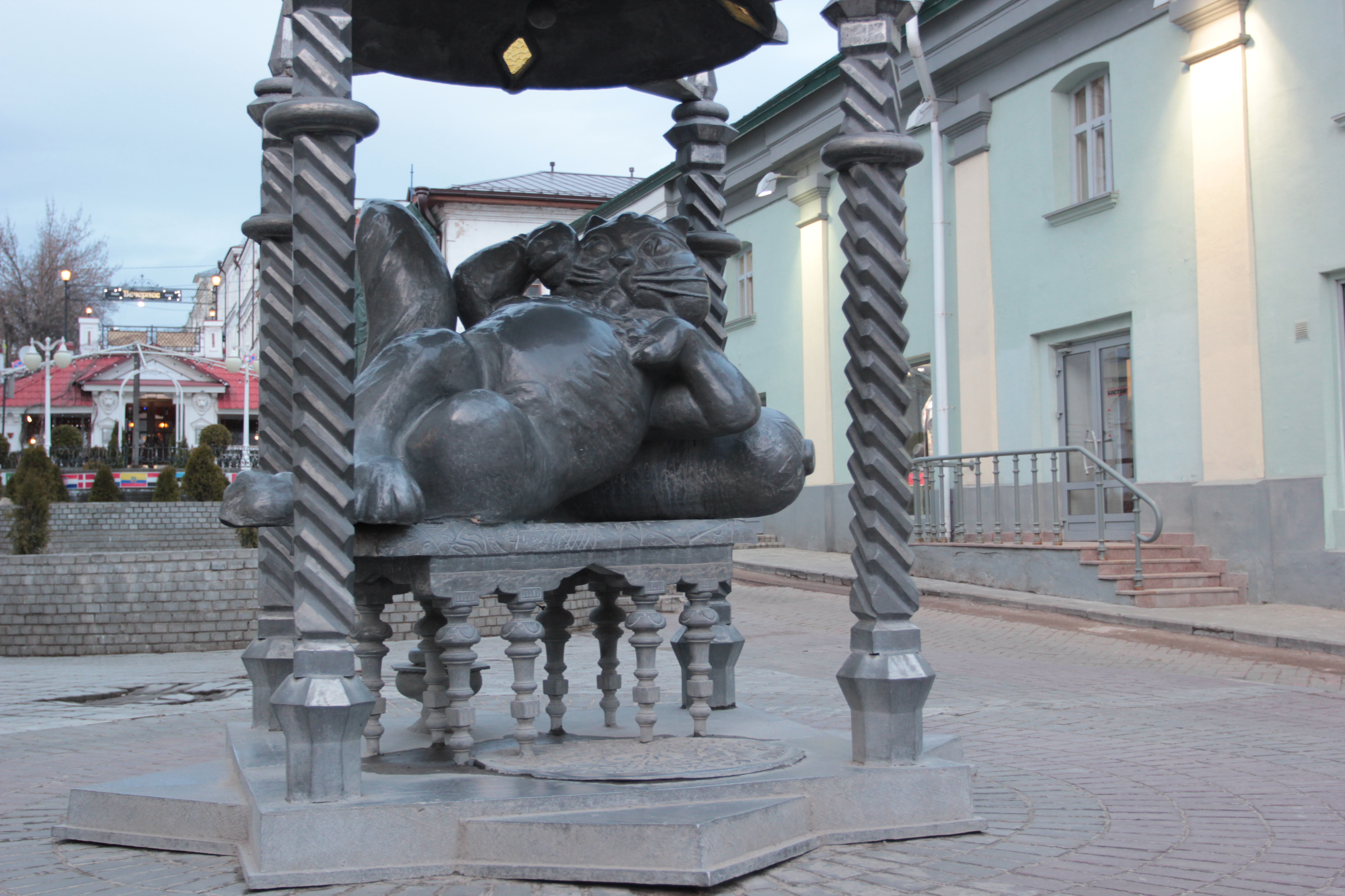 Ещё один персонаж на счастье – «Кот казанский». Его скульптура установлена на пешеходной улице Баумана, которую ещё называют Казанским Арбатом. Согласно преданию, чтобы во всём сопутствовала удача, нужно погладить коту брюшко.