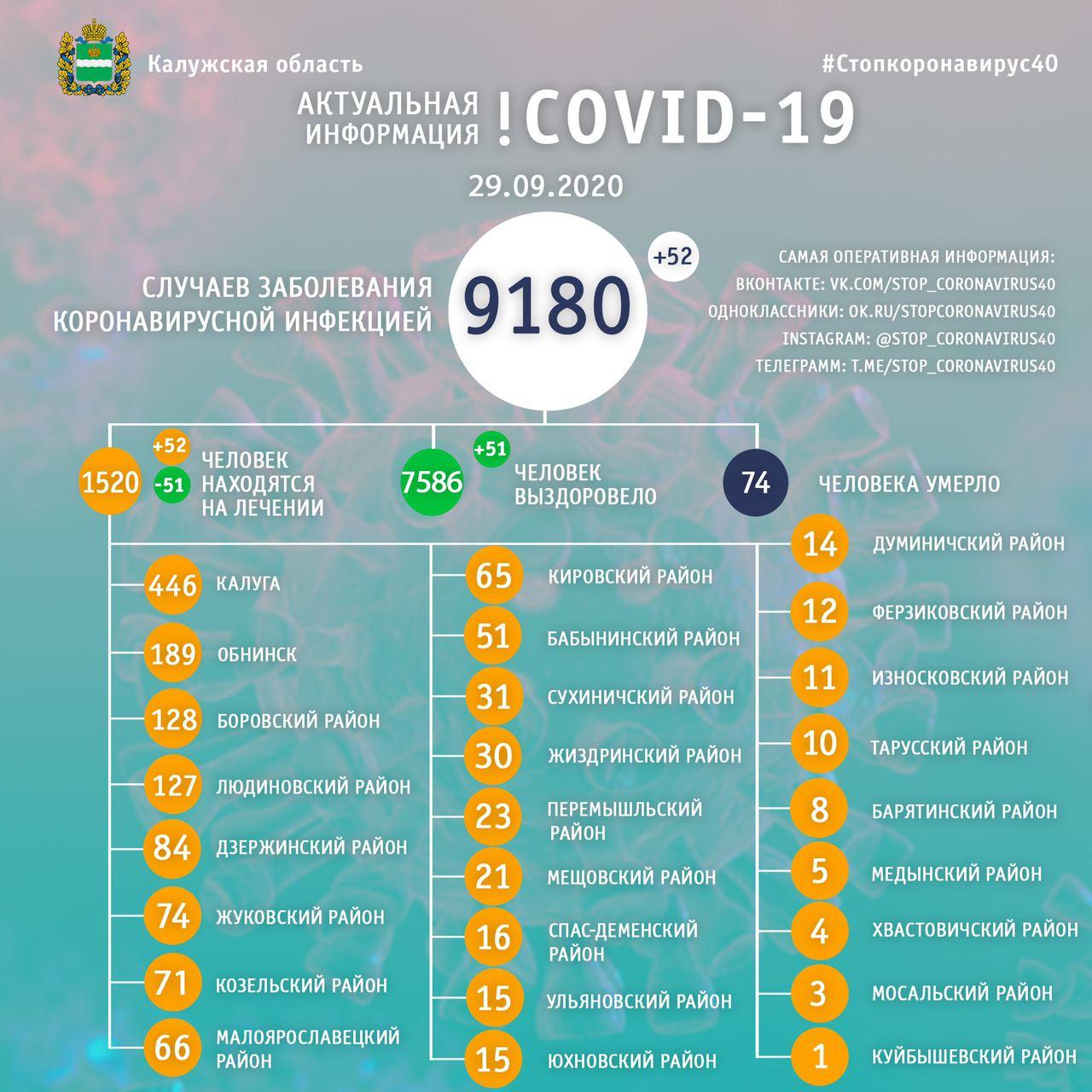 Официальная статистика по коронавирусу в Калужской области на 29 сентября 2020 года.