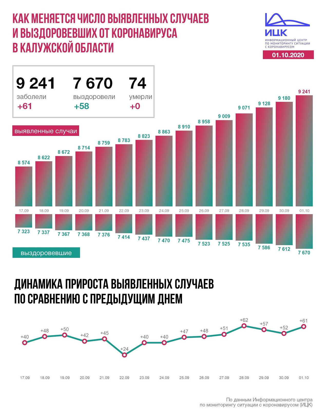 За последние сутки в Калужской области ещё 58 человек вылечились от коронавируса. Всего с болезнью справились 7670 жителей региона, сообщили KP40 в четверг, 1 октября, в федеральном оперативном штабе.