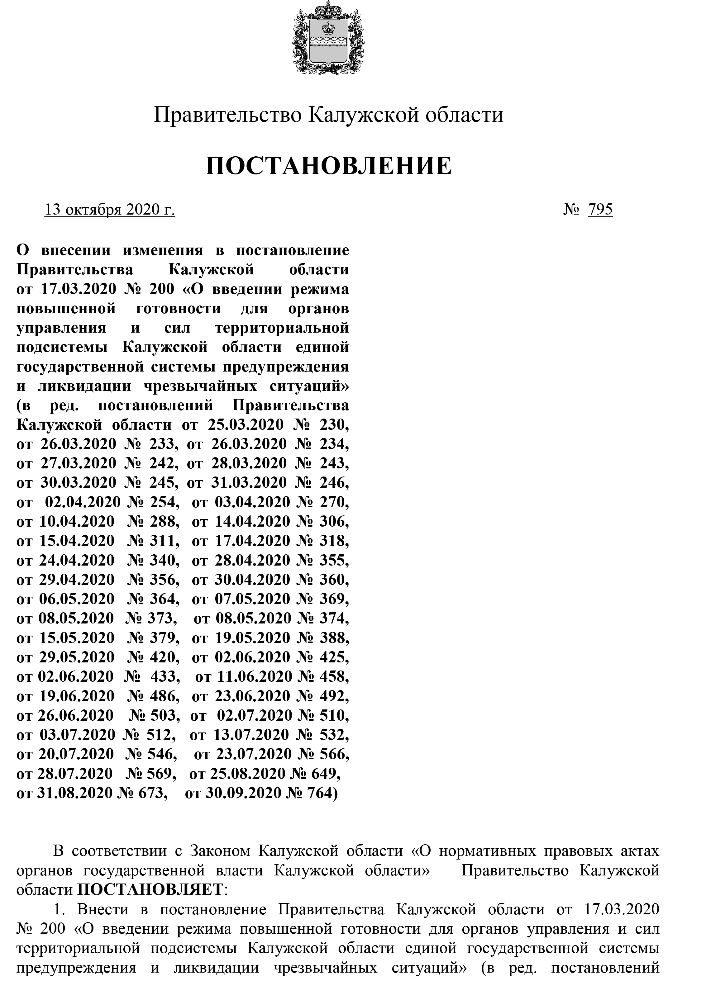 Полный текст постановления правительства Калужской области №795 от 13.10.2020: