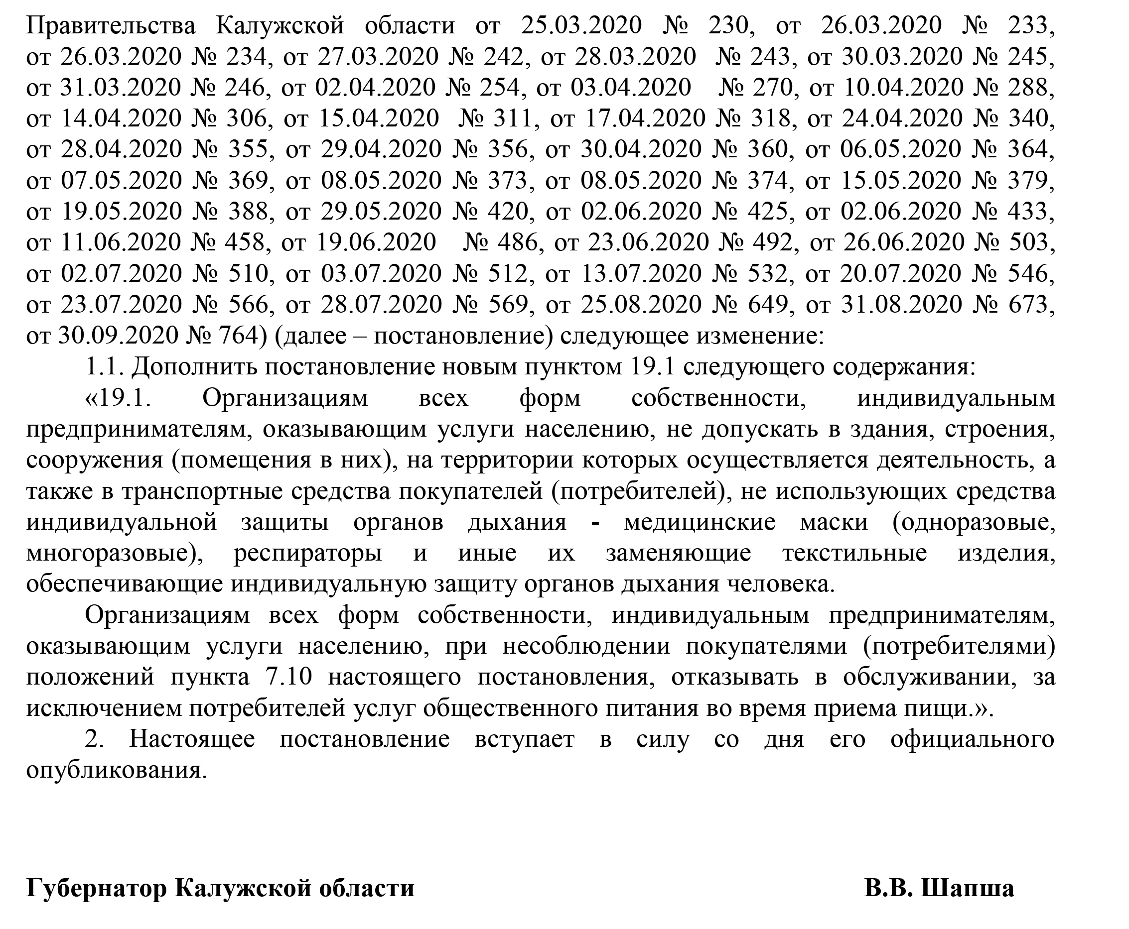 Во вторник, 13 октября, губернатор Калужской области Владислав ШАПША подписал постановление правительства №795. Этим документом ужесточается масочный режим в нашем регионе.