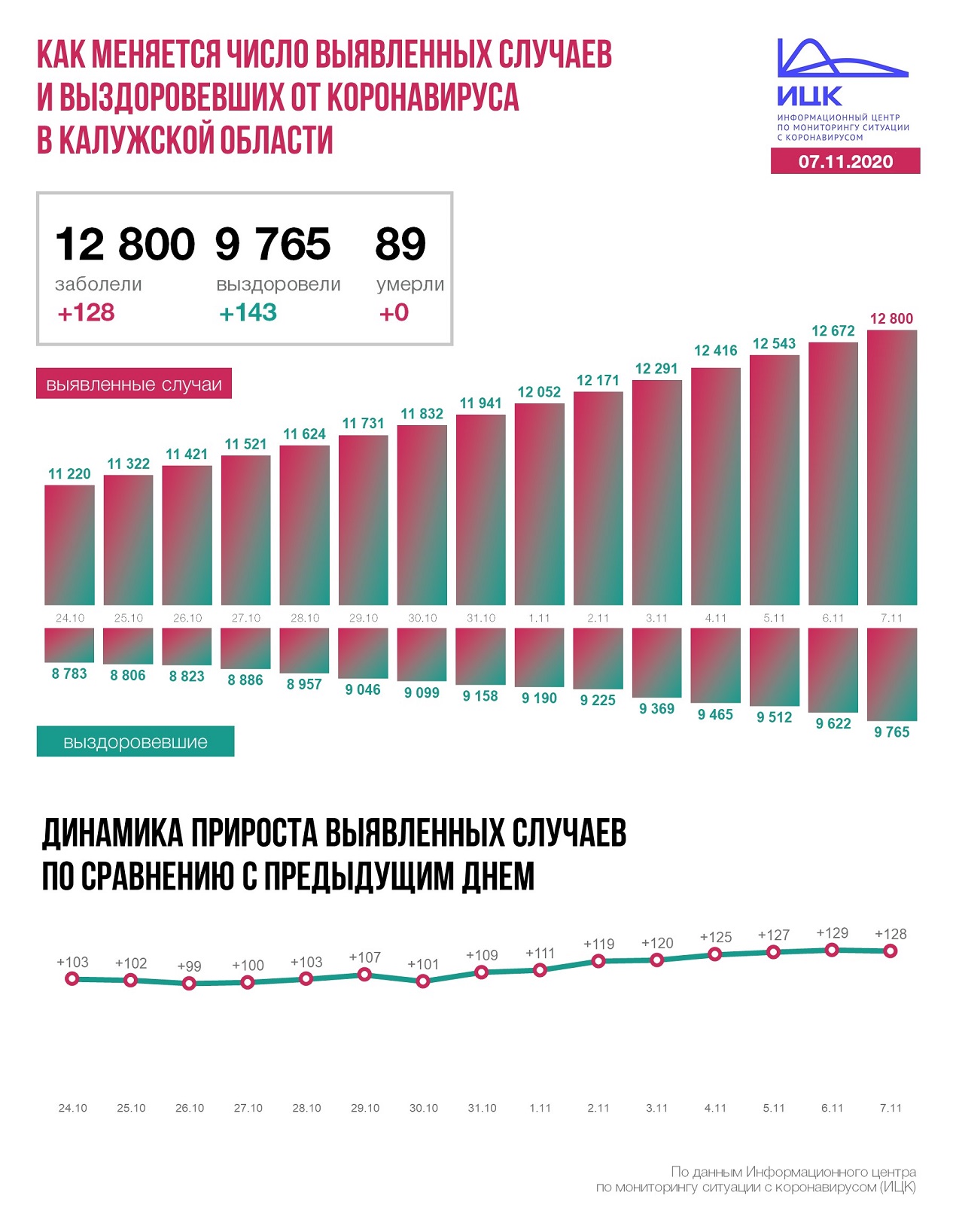 За последние сутки в Калужской области подтвердили еще 128 случаев заболевания коронавирусом. Что меньше, чем 6 ноября. Общее количество зараженных достигло 12 800, сообщили KP40 в субботу, 7 ноября, в федеральном оперативном штабе.