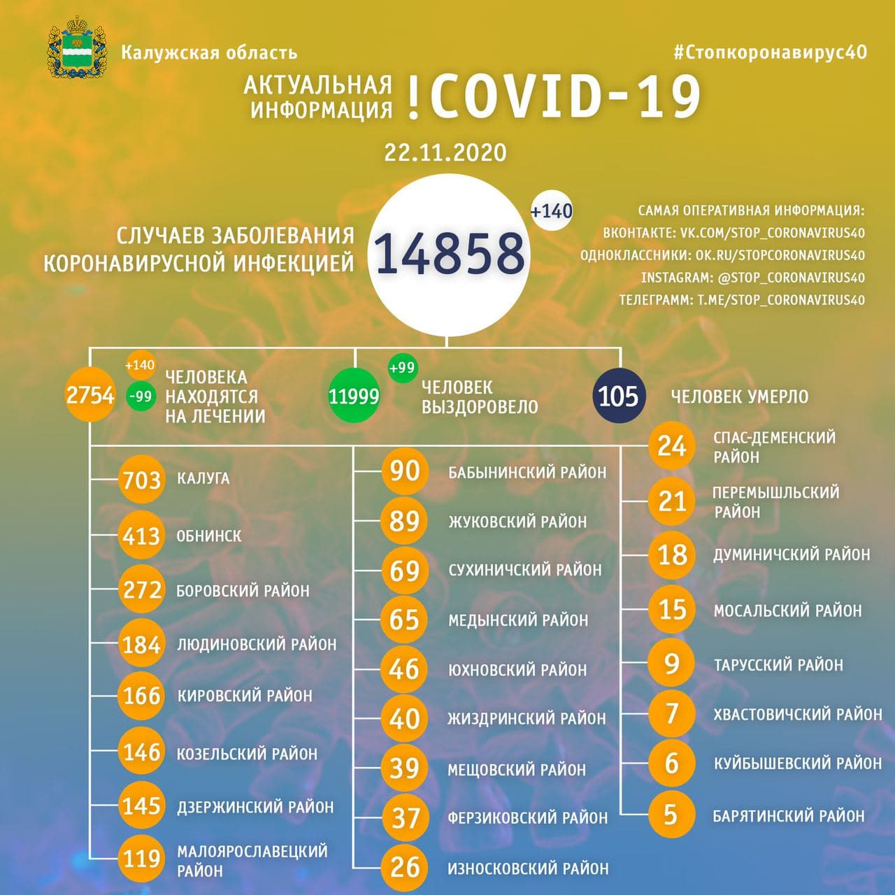 Официальная статистика по коронавирусу в Калужской области на 22 ноября 2020 года.