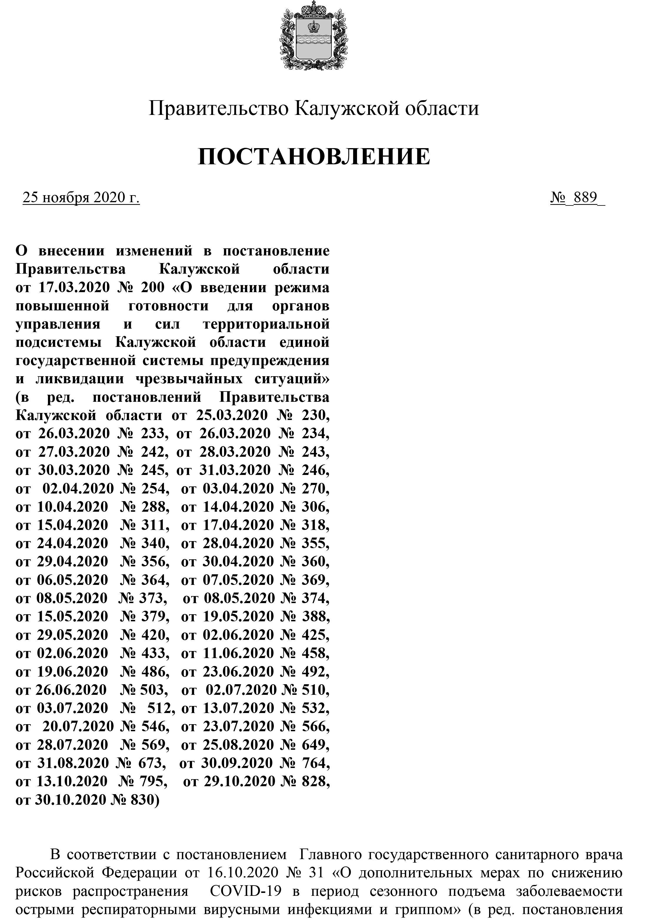 Публикуем полный текст постановления Калужской области №889 от 25 ноября 2020 года: