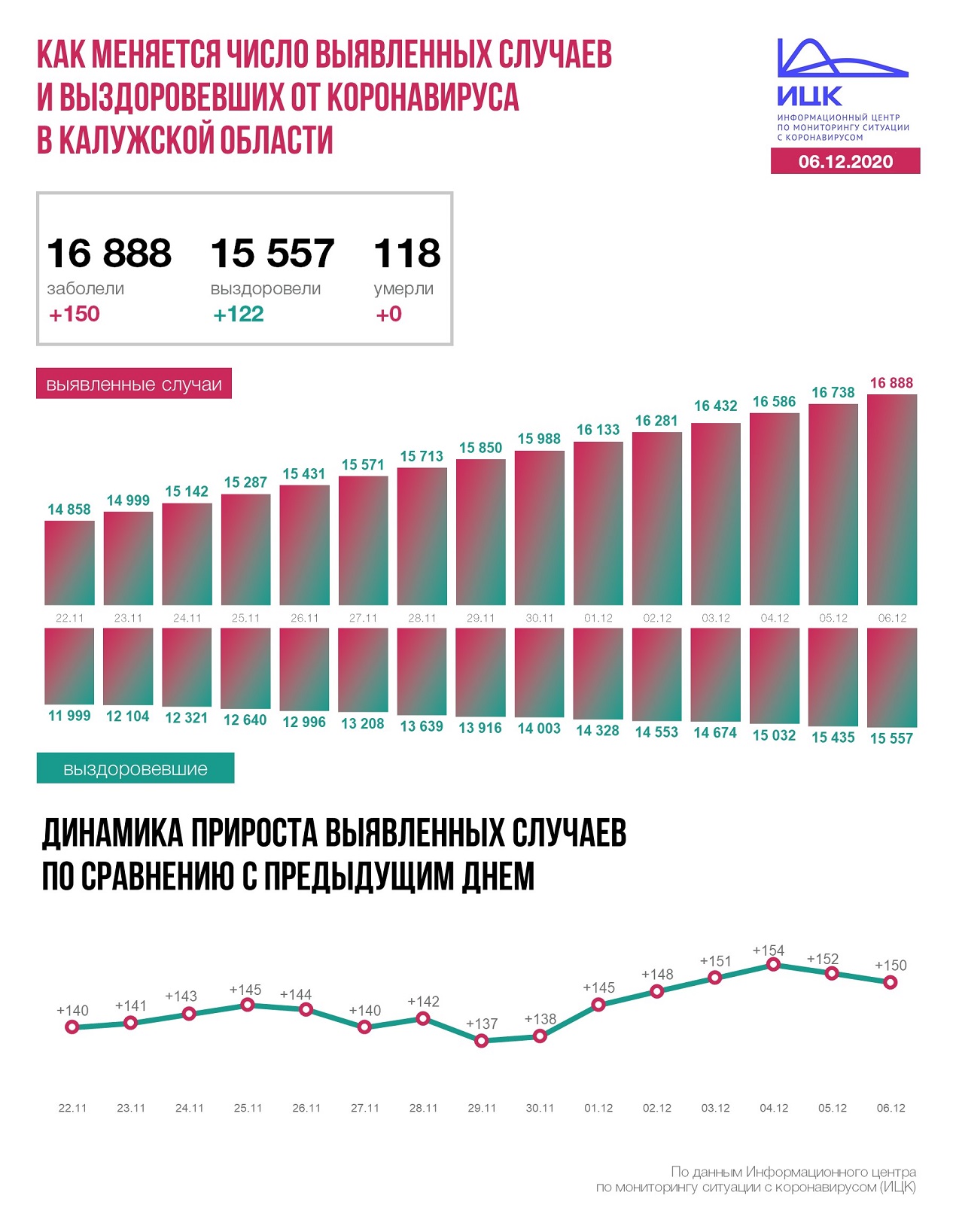 В воскресенье, 6 декабря, в Калужской области подтвердили еще 150 случаев заболевания коронавирусом. Теперь заражений в регионе в общей сложности - 16 888.