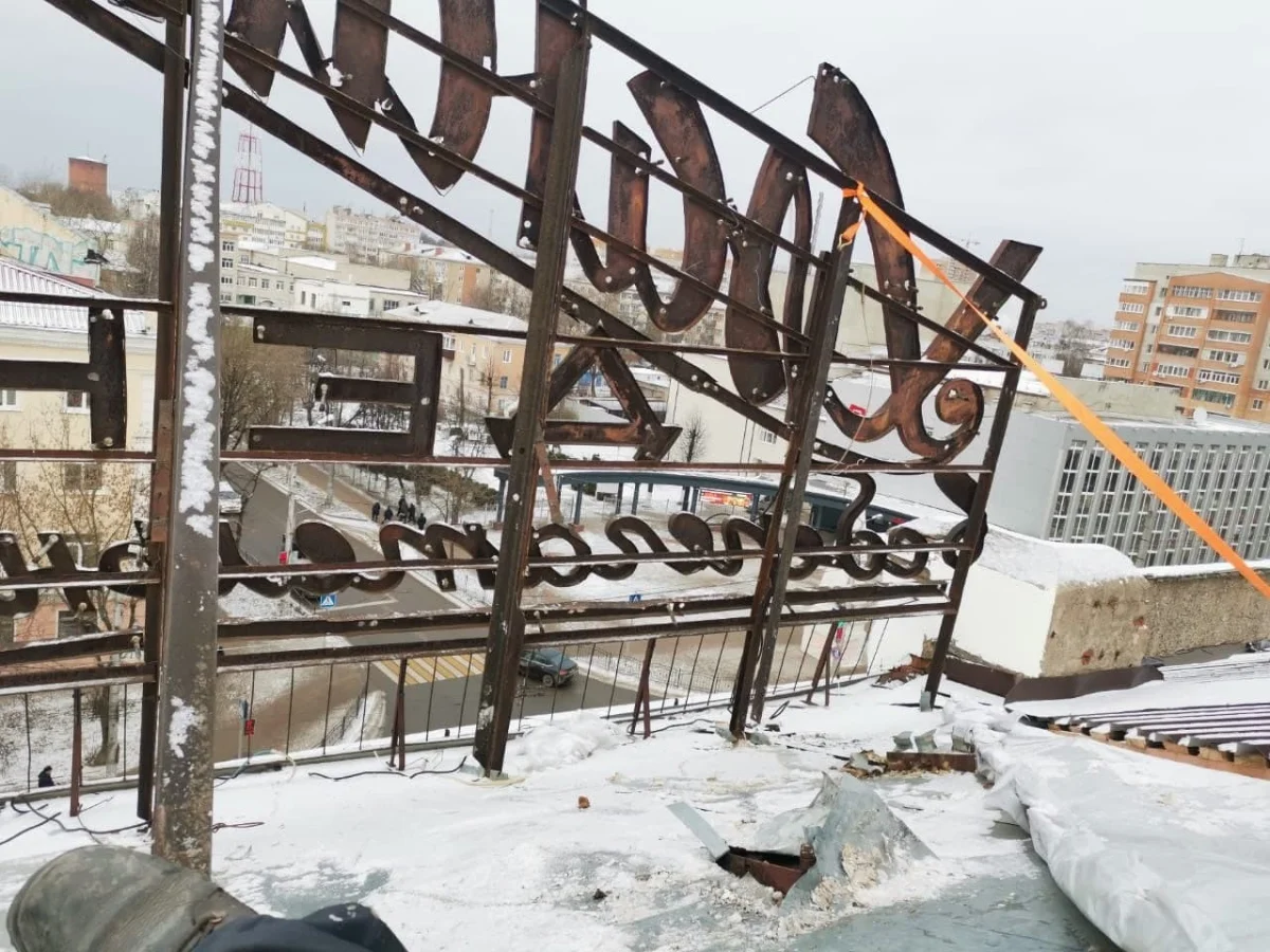 В понедельник, 7 декабря, с крыши дома №59 на улице Ленина в Калуге демонтировали старую вывеску «Храните деньги в сберегательной кассе». Об этом сообщил городской голова Дмитрий ДЕНИСОВ.