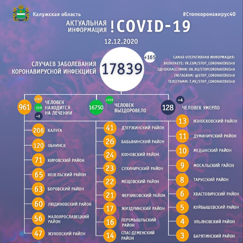 Официальная статистика по коронавирусу в Калужской области на 12 декабря 2020 года.