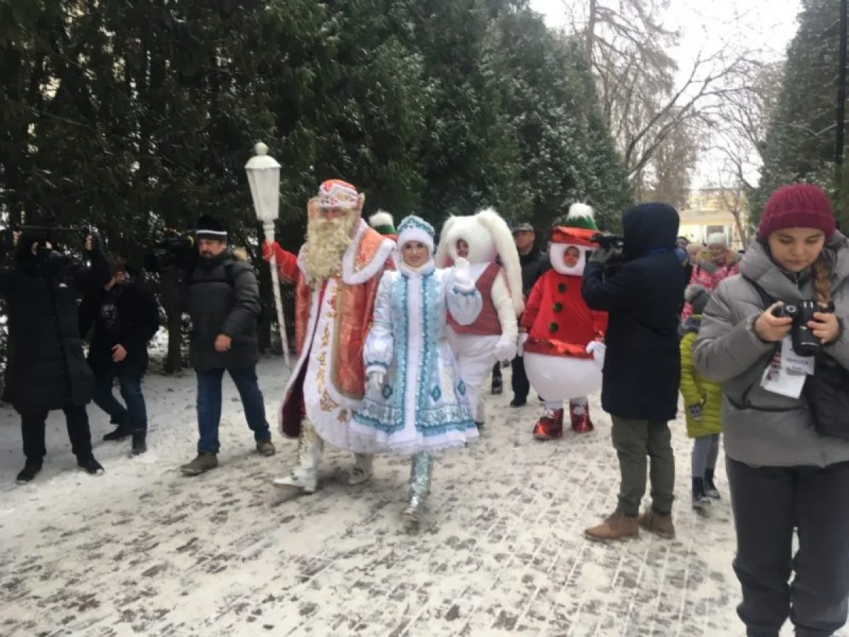 Главный новогодний герой вошёл в парк в сопровождении внучки снегурочки и снеговика. Все они осмотрели новогоднюю елку, а затем проследовали к самой резиденции.