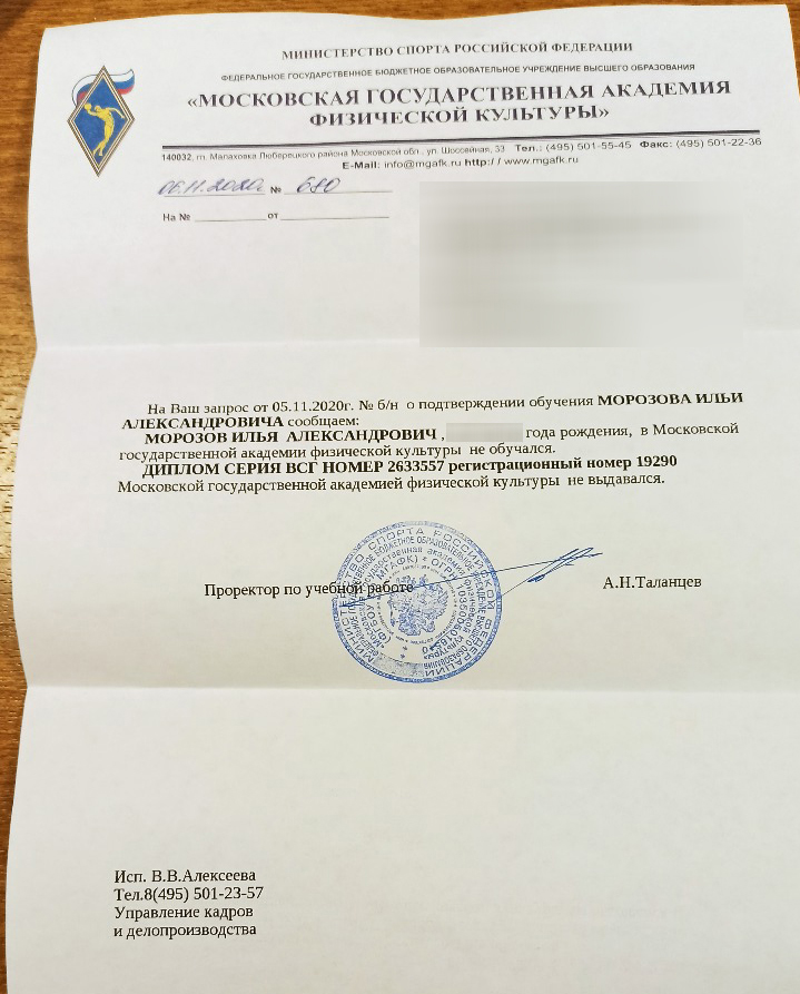 В Московской государственной академии физической культуры 5 ноября 2020 года ответили, что Илья Александрович Морозов не проходил у них обучения.