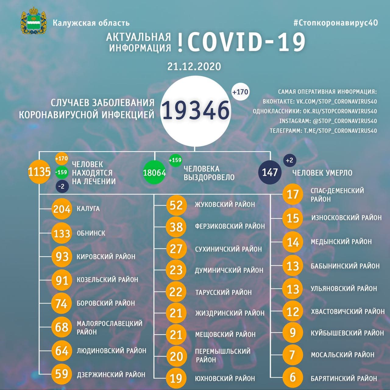 Официальная статистика по коронавирусу в Калужской области на 21 декабря 2020 года.