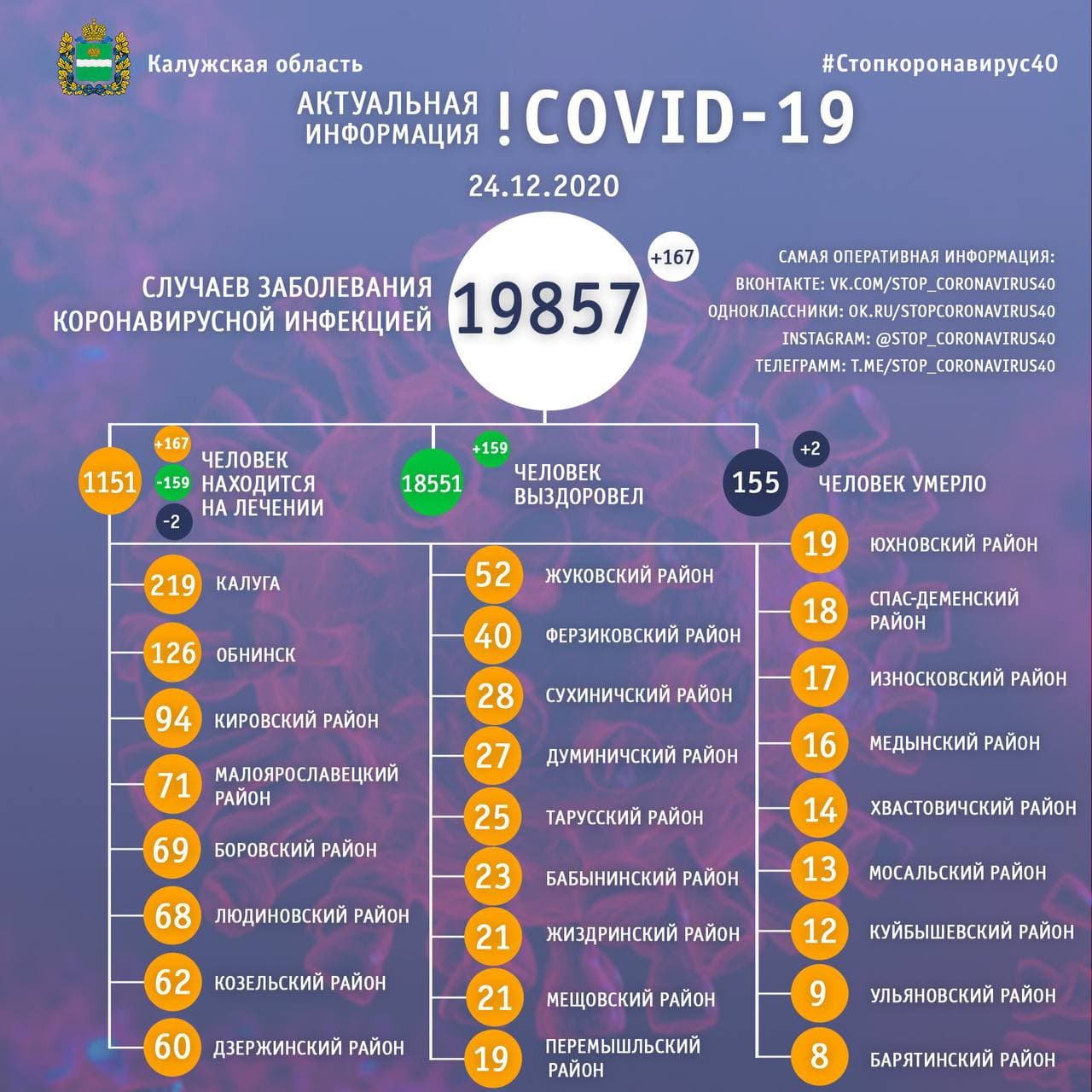 В Калужской области в четверг, 23 декабря, подтвердили 167 новых случаев заражения коронавирусной инфекцией. Общее число заболевших выросло до 19 857, сообщили в региональном оперативном штабе.