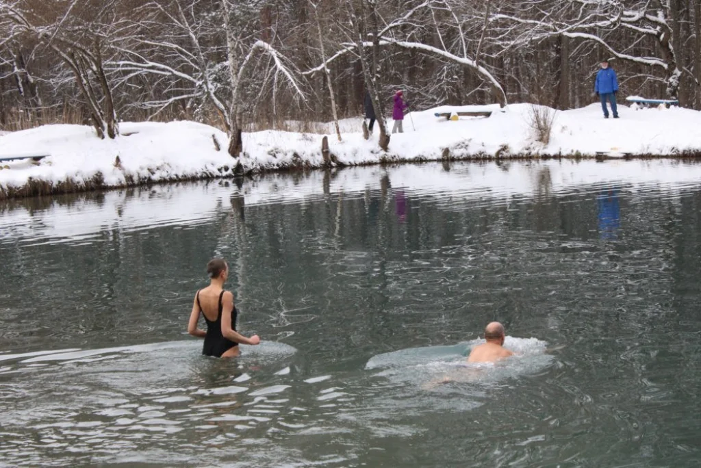 В воскресенье, 27 декабря, калужские «моржи» вновь облюбовали Сероводородные озера. В преддверии Нового года к ним присоединились Дед Мороз и Снегурочка. Они поздравили калужан с наступающими праздниками и провели зарядку перед заплывом. Также за купаниями «моржей» наблюдал городской голова Дмитрий Денисов.