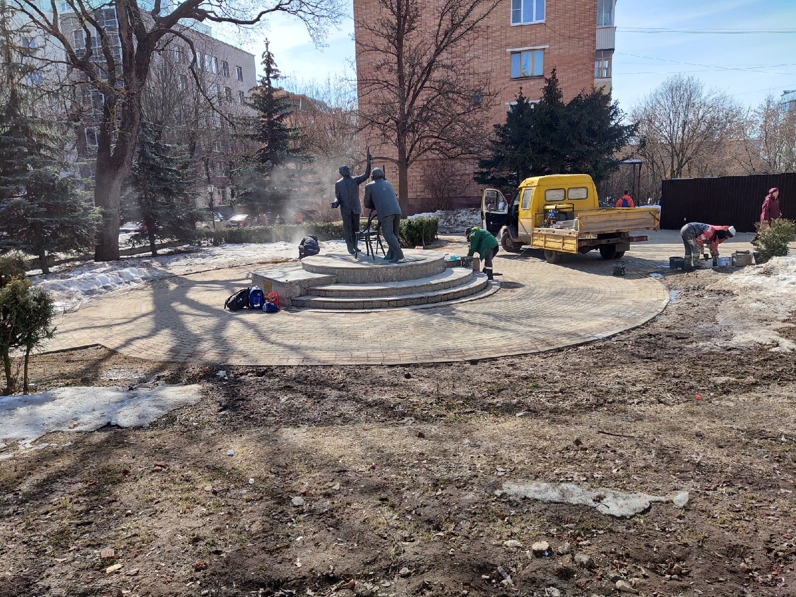 Коммунальщики работают у памятника Королеву и Циолковскому.