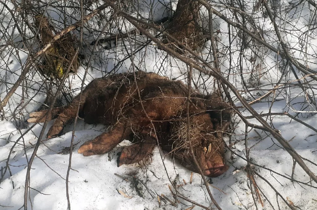 Как мы уже рассказывали, в воскресенье, 28 марта, в районе деревни Галкино на севере Калуги обнаружен труп дикого кабана.