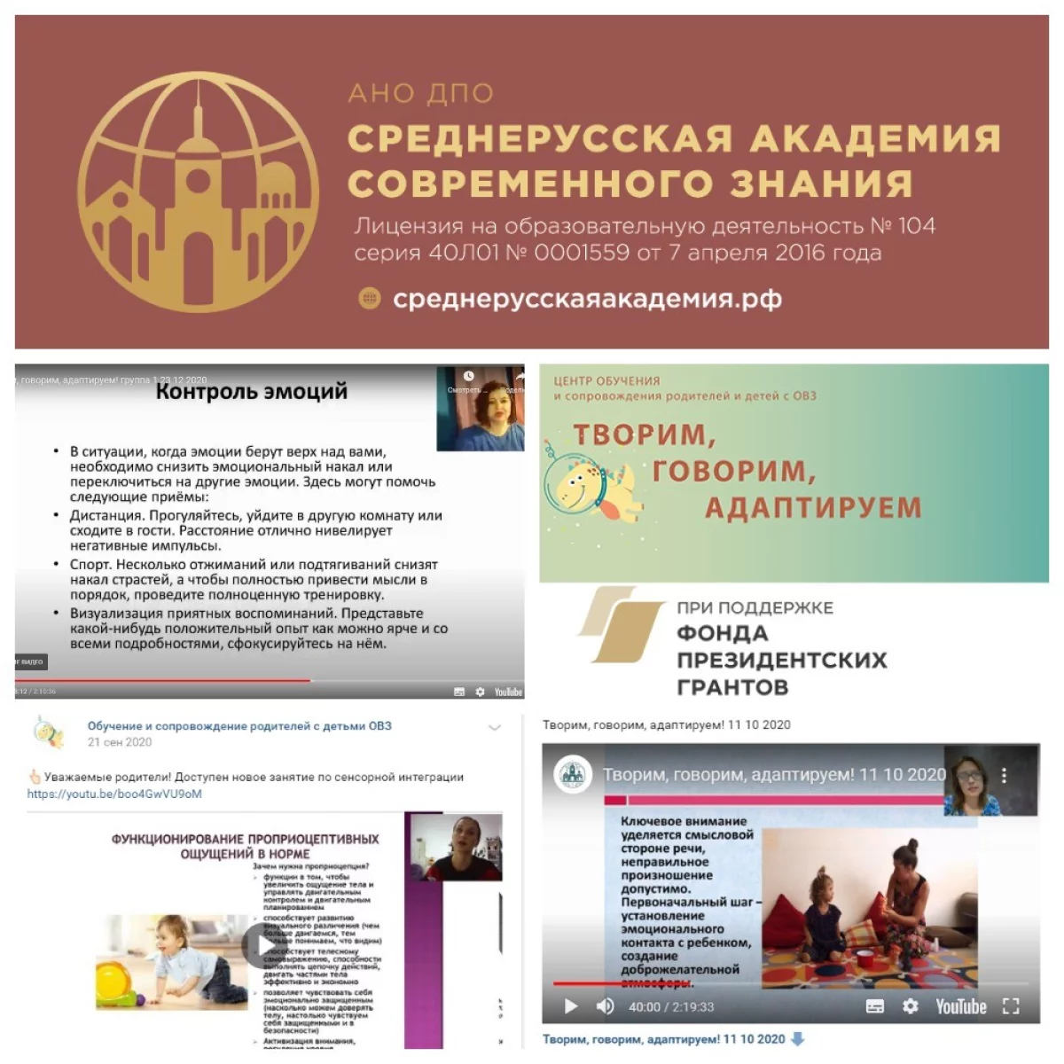 В 2020 году Среднерусская академия современного знания победила в конкурсе Фонда президентских грантов. Суть проекта заключалась в создании центра для родителей особенных детей «Творим, говорим, адаптируем». Эта площадка дала им возможность при поддержке логопедов и специалистов в сенсорной интеграции научиться простым, но действенным методам, занятиям, играм, которые помогут детям развиваться. Эти навыки родители теперь применяют самостоятельно. Кроме того, на протяжении курса проводились тренинги, направленные на развитие эмпатии, самомотивации, самоконтроля. Важной целью тренингов стало снятие психологической нагрузки с родителей ребёнка с особенностями развития.