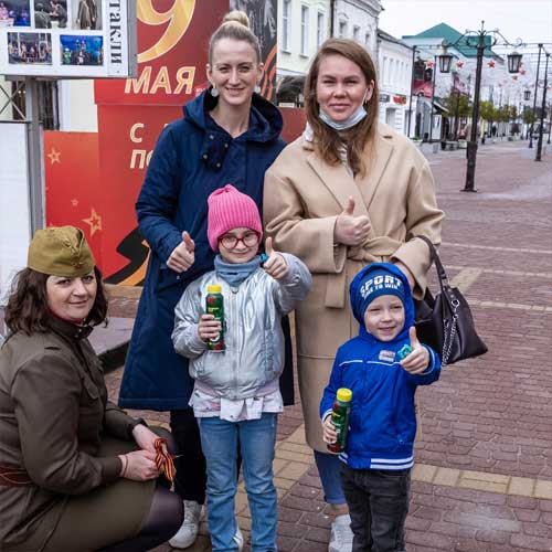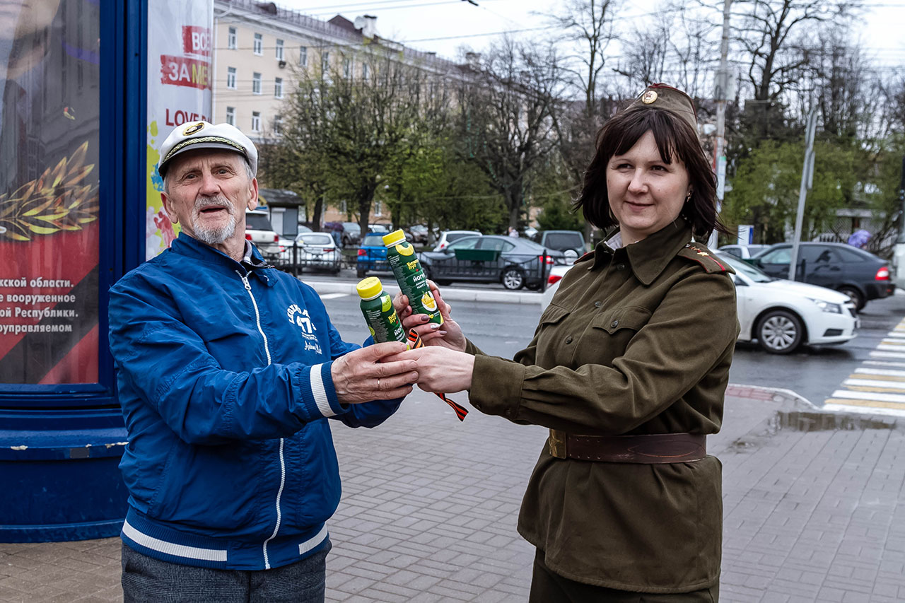Обычно по Театральной улице люди идут не спеша. Но в этот день калужане и гости города торопились: дождливо, ветрено, не уютно. Правда, для многих приятным сюрпризом стали вкусные подарки от Тульского Молочного Завода, который совместно с агентством «Комсомольская Правда», провел накануне 9 мая акцию, приуроченную ко Дню победы.