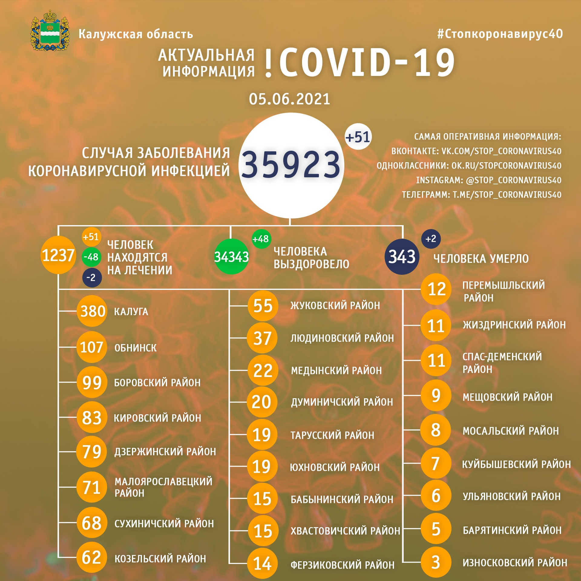 Официальная статистика по коронавирусу в Калужской области на 5 июня 2021 года.