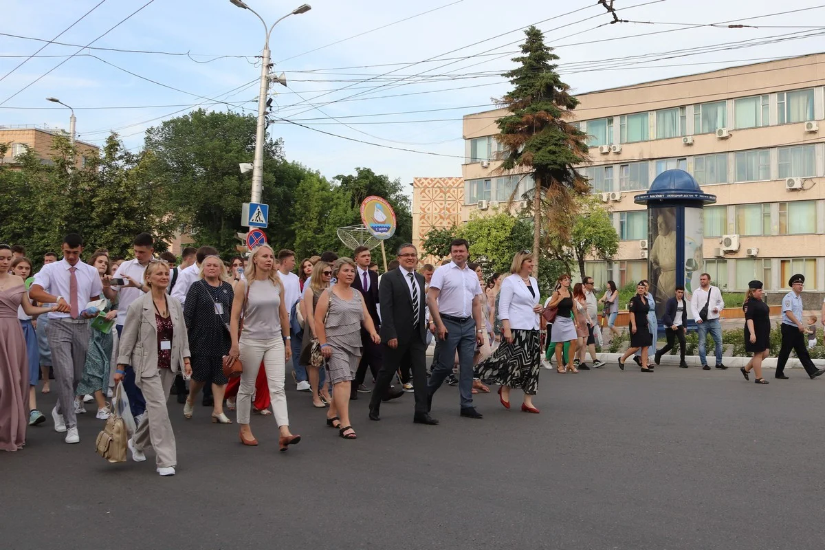 Началось мероприятие с возложения цветов к Вечному Огню на площади Победы, затем выпускники и руководство города прошли в праздничной колонне к Городскому парку культуры и отдыха.
