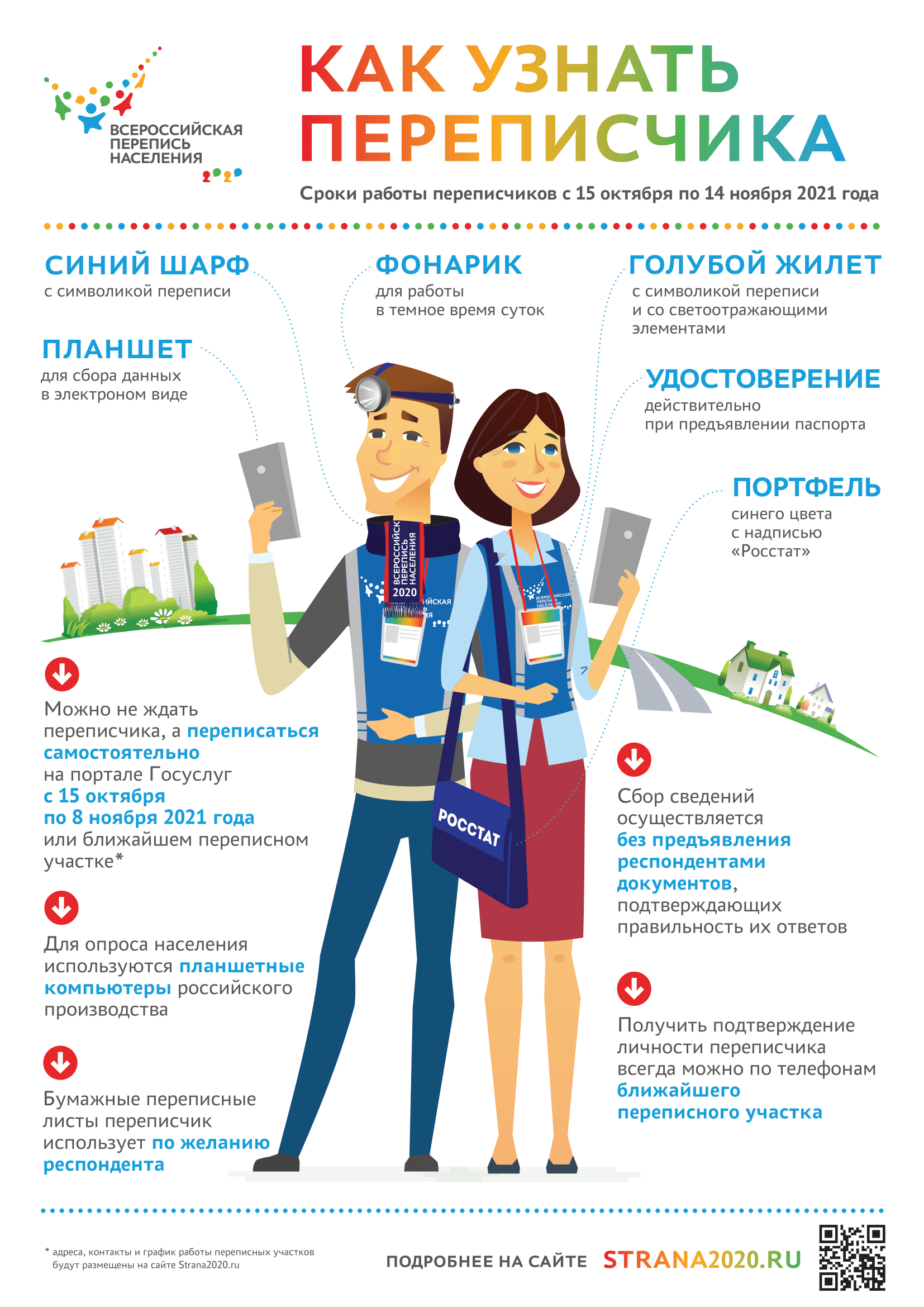 - При себе переписчик будет иметь нагрудное удостоверение, сумку-портфель синего цвета с надписью «Росстат», брендированный шарф сине-красной расцветки с белой надписью «Всероссийская перепись населения» и голубой жилет со светоотражающими полосами и логотипом переписи. Каждый переписчик будет иметь электронный планшет и налобный фонарик для работы в темное время суток. Обращаем внимание, что удостоверение переписчика действительно только при предъявлении паспорта.