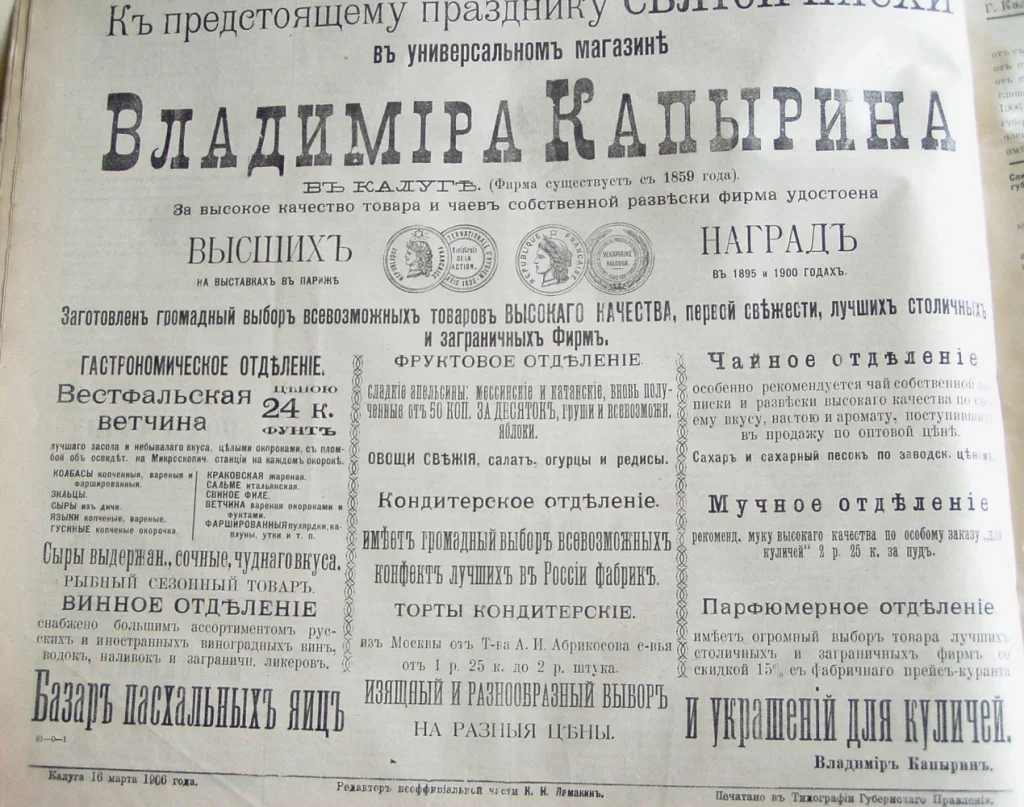 1911 – (старый стиль) на Пятницком кладбище состоялось погребение умершего от воспаления легких Владимира Сергеевича Капырина - старшего из владельцев знаменитого в Калуге гастрономического магазина (фирма существовала с 1859 года). (К.Афанасьев «Летопись провинции»). В своих публикациях В.Продувнов отмечал, что калужский купец В.С.Капырин, гласный Калужской городской Думы, скончался в Москве 20 октября (ст. стиль)