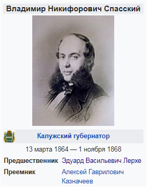 1868 – пост калужского губернатора, который он занимал четыре года, покидает Владимир Никифорович Спасский (1824 – 7.04.1877) – тайный советник, камергер. При Спасском продолжалось благоустройство губернского центра. Мостились улицы, строились новые частные каменные дома.