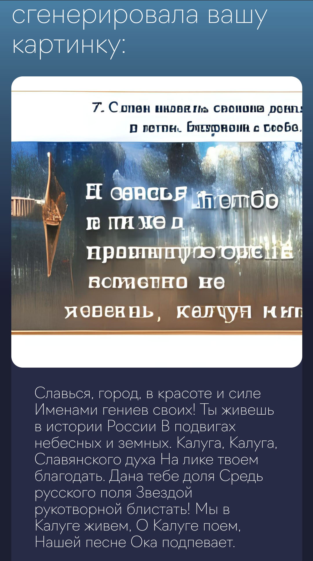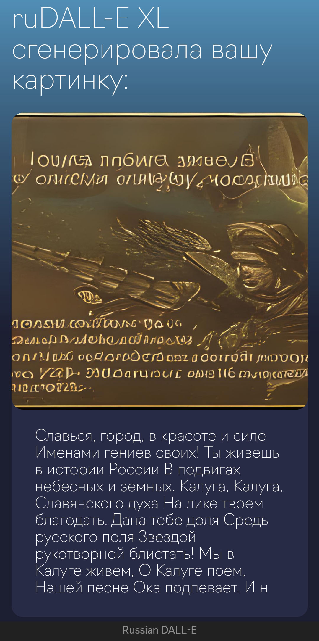 Дальше — больше. Мы решили скормить ruDALL-E гимн Калуги. Не новомодные поделки, а классический от Туликова. И вот что получилось в первый раз.