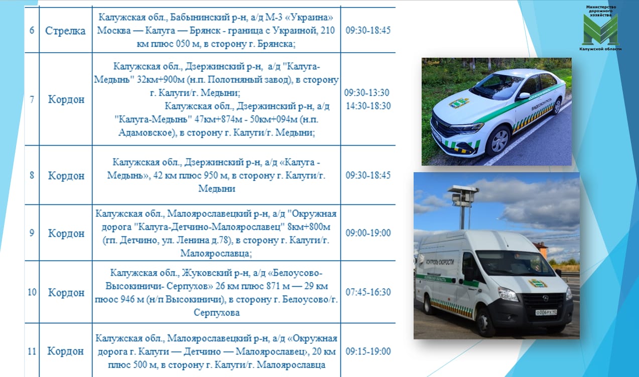 А также на трассе М-3 «Украина» и автодорогах «Окружная дорога города Калуги», Белоусово-Высокиничи-Серпухов, Калуга-Медынь в Жуковском, Малоярославецком, Боровском, Бабынинском и Дзержинском районах.