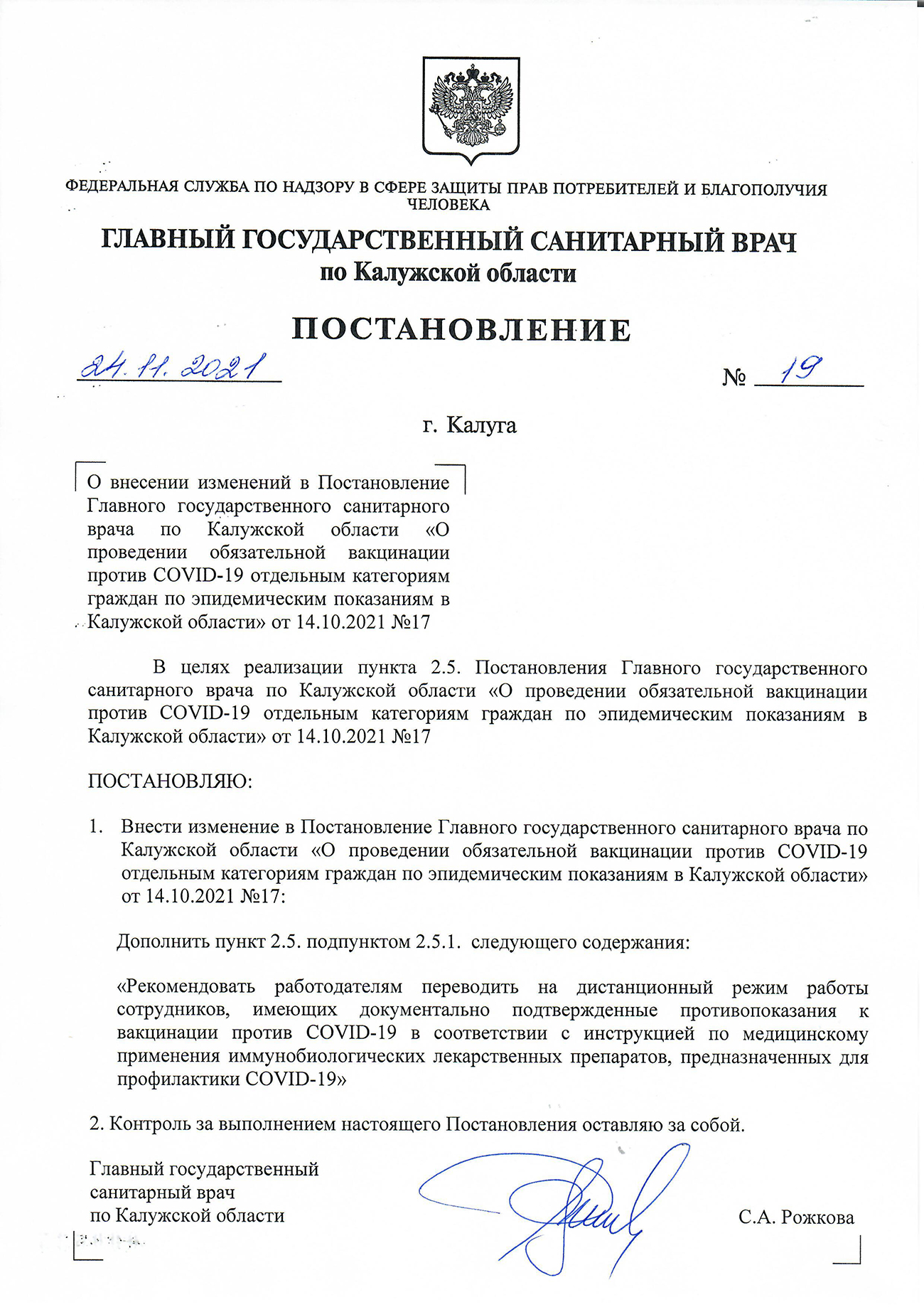 Постановление №19 управления Роспотребнадзора по Калужской области от 24 ноября 2021 года: