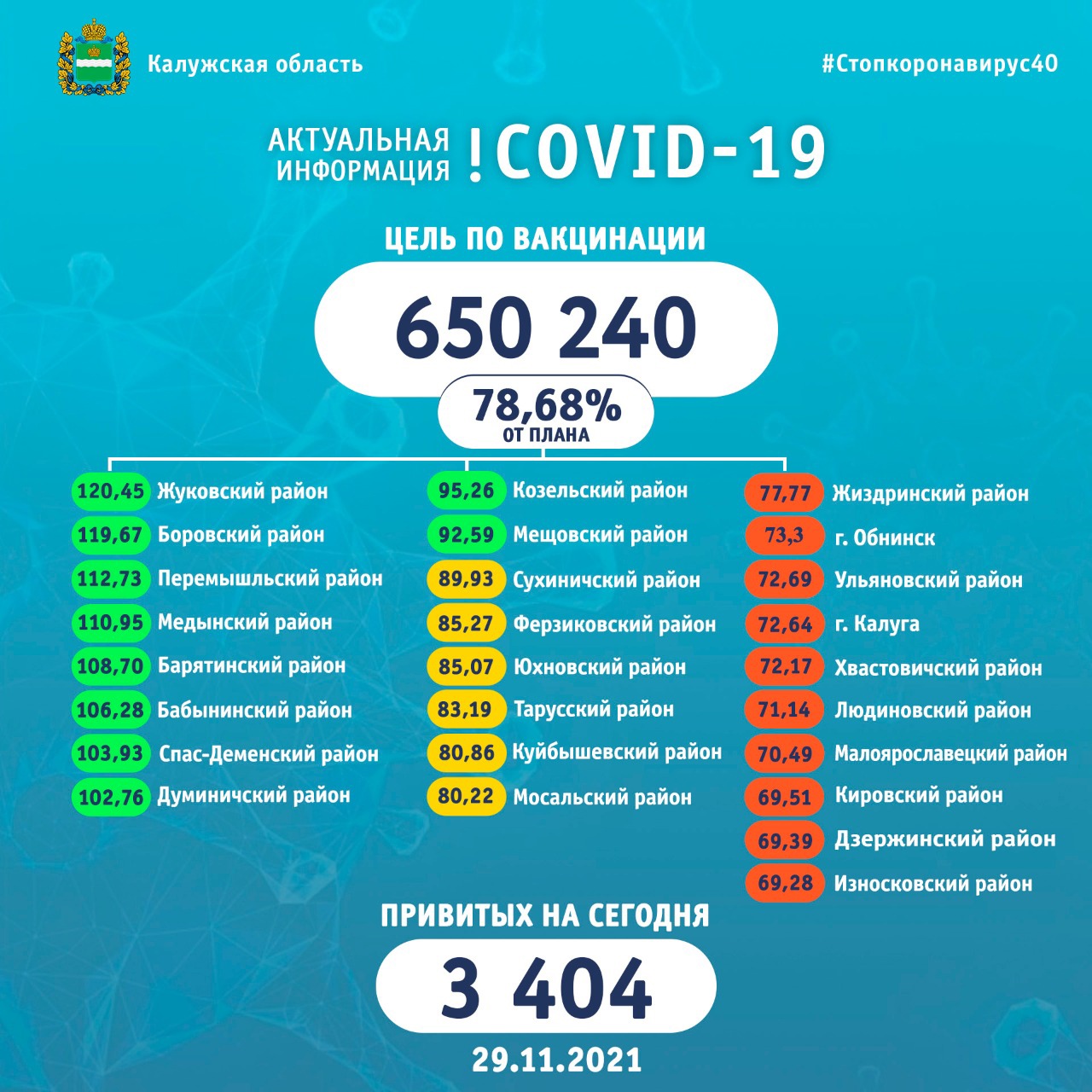 Выполнение плана по вакцинации от коронавируса в районах Калужской области на 29 ноября 2021 года: