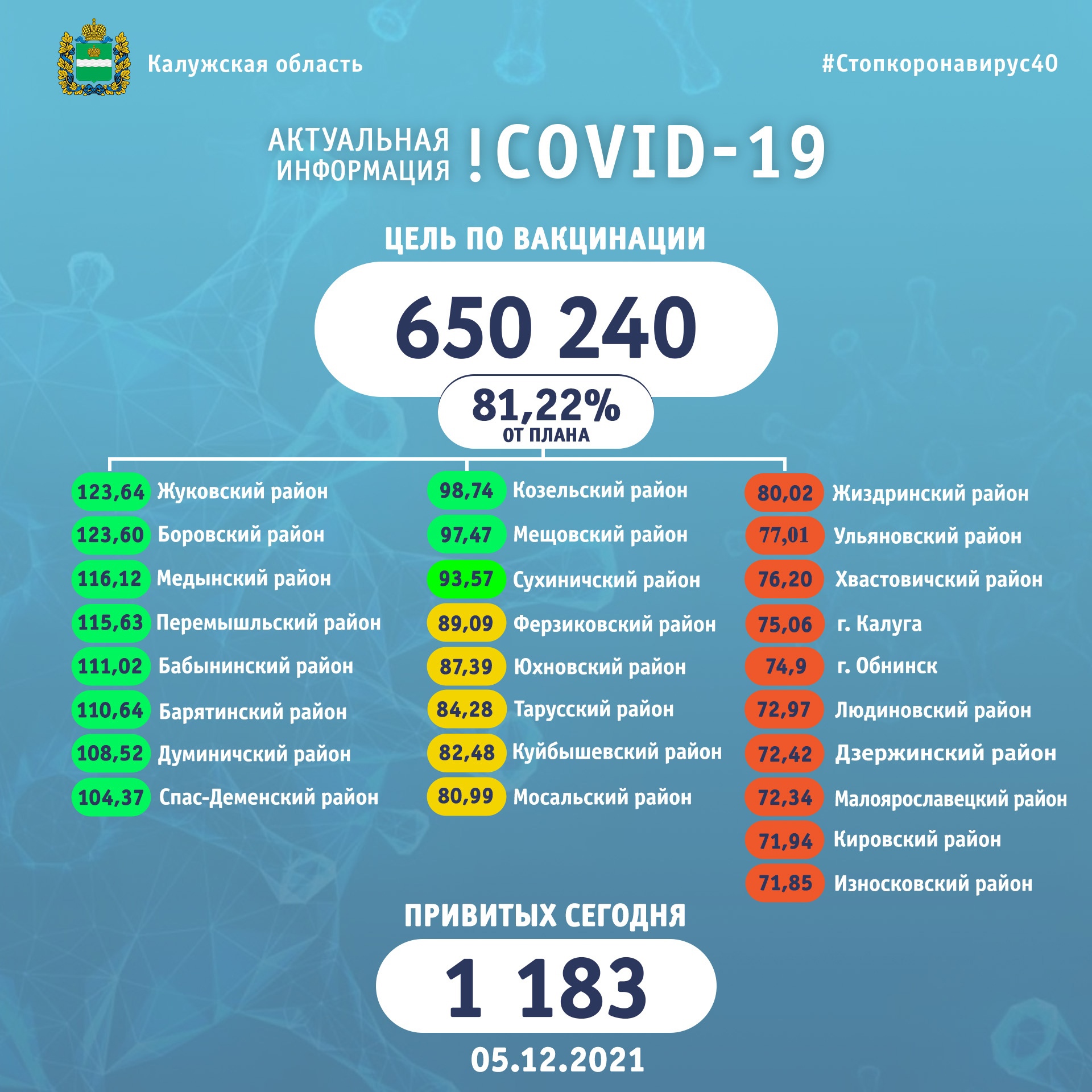 Выполнение плана по вакцинации от коронавируса в районах Калужской области на 5 декабря 2021 года: